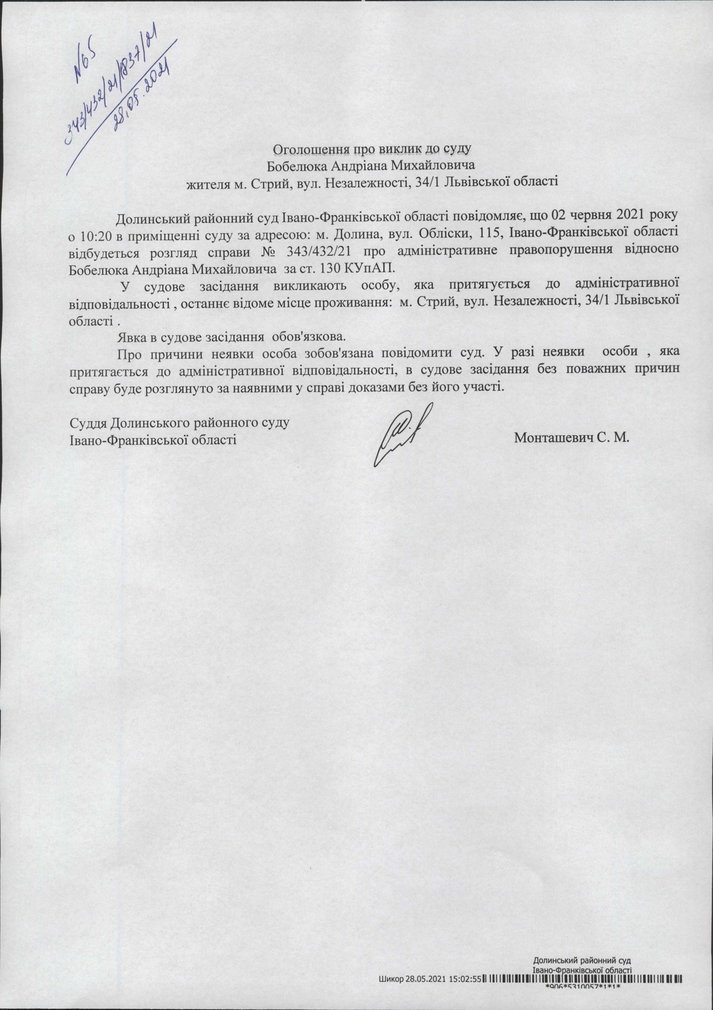 ОГОЛОШЕННЯ ПРО ВИКЛИК до СУДУ Бобелюка Андріана Михайловича у справі про адміністративне правопорушення № 343/432/21