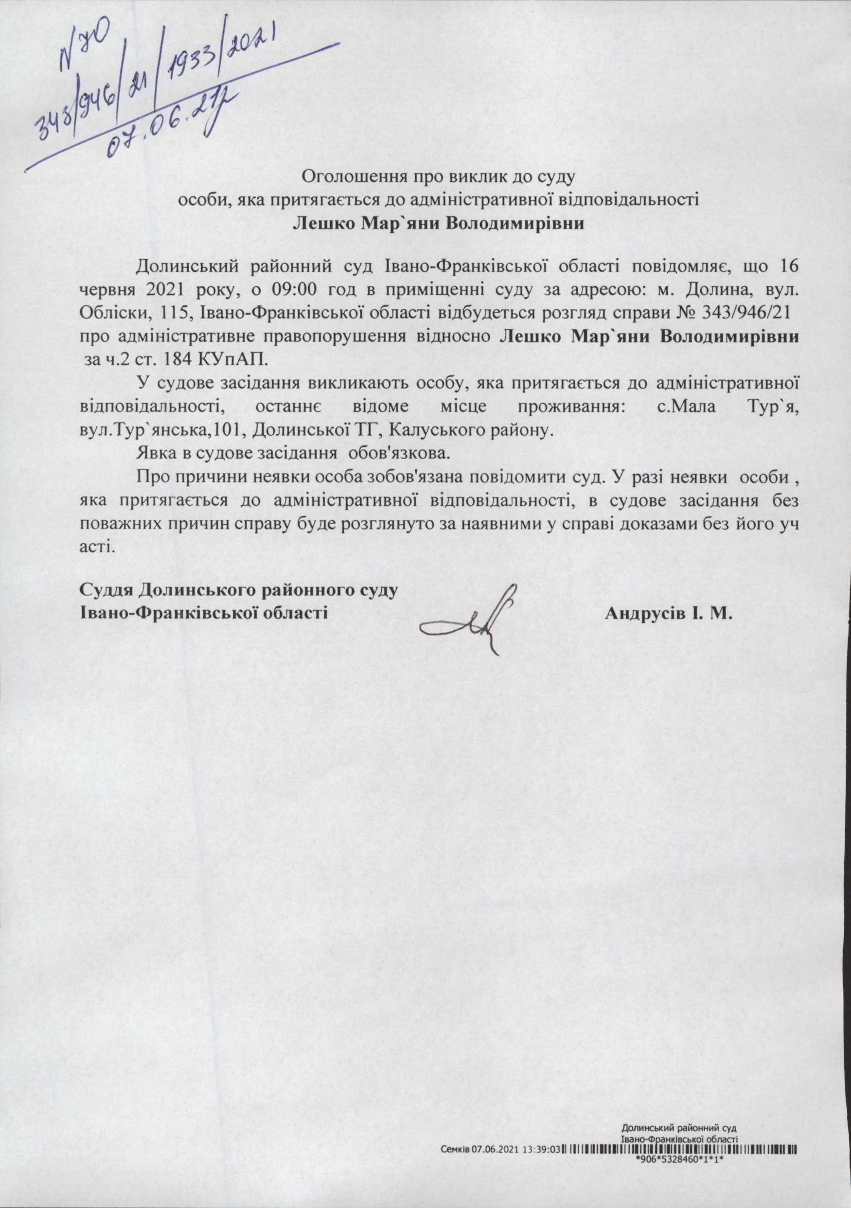 ОГОЛОШЕННЯ ПРО ВИКЛИК до СУДУ Лешко Мар'яни Володимирівни у справі про адміністративне правопорушення № 343/946/21
