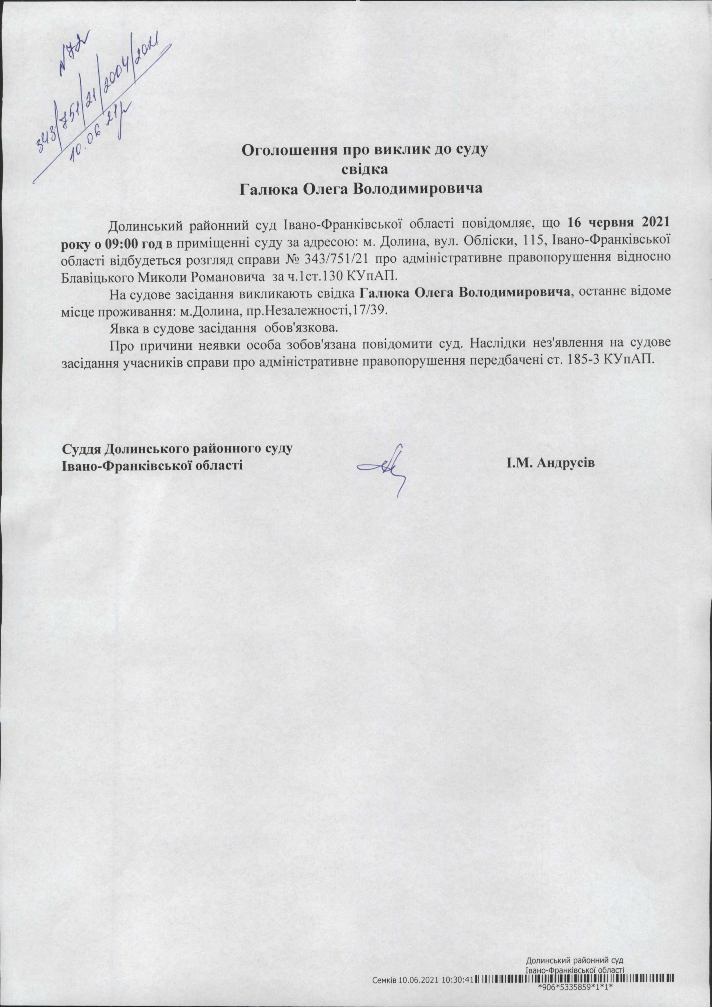 ОГОЛОШЕННЯ ПРО ВИКЛИК до СУДУ Галюка Олега Володимировича у справі про адміністративне правопорушення № 343/751/21