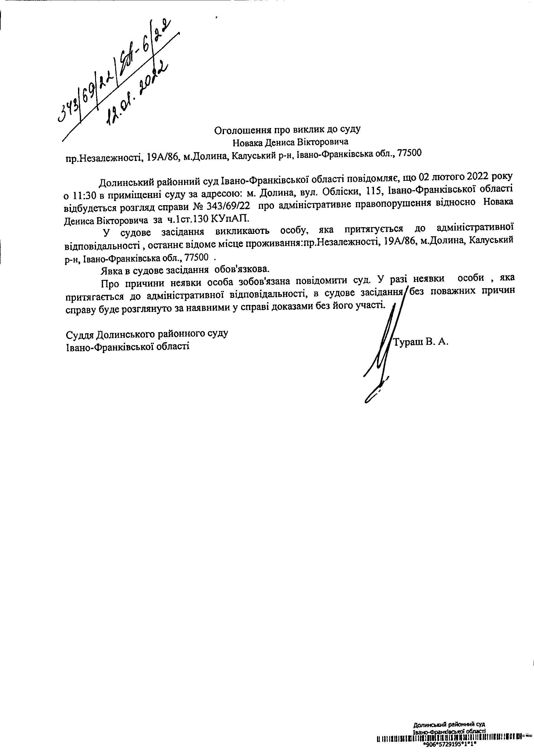 ОГОЛОШЕННЯ ПРО ВИКЛИК до СУДУ Новака Дениса Вікторовича у справі про адміністративне правопорушення № 343/69/22