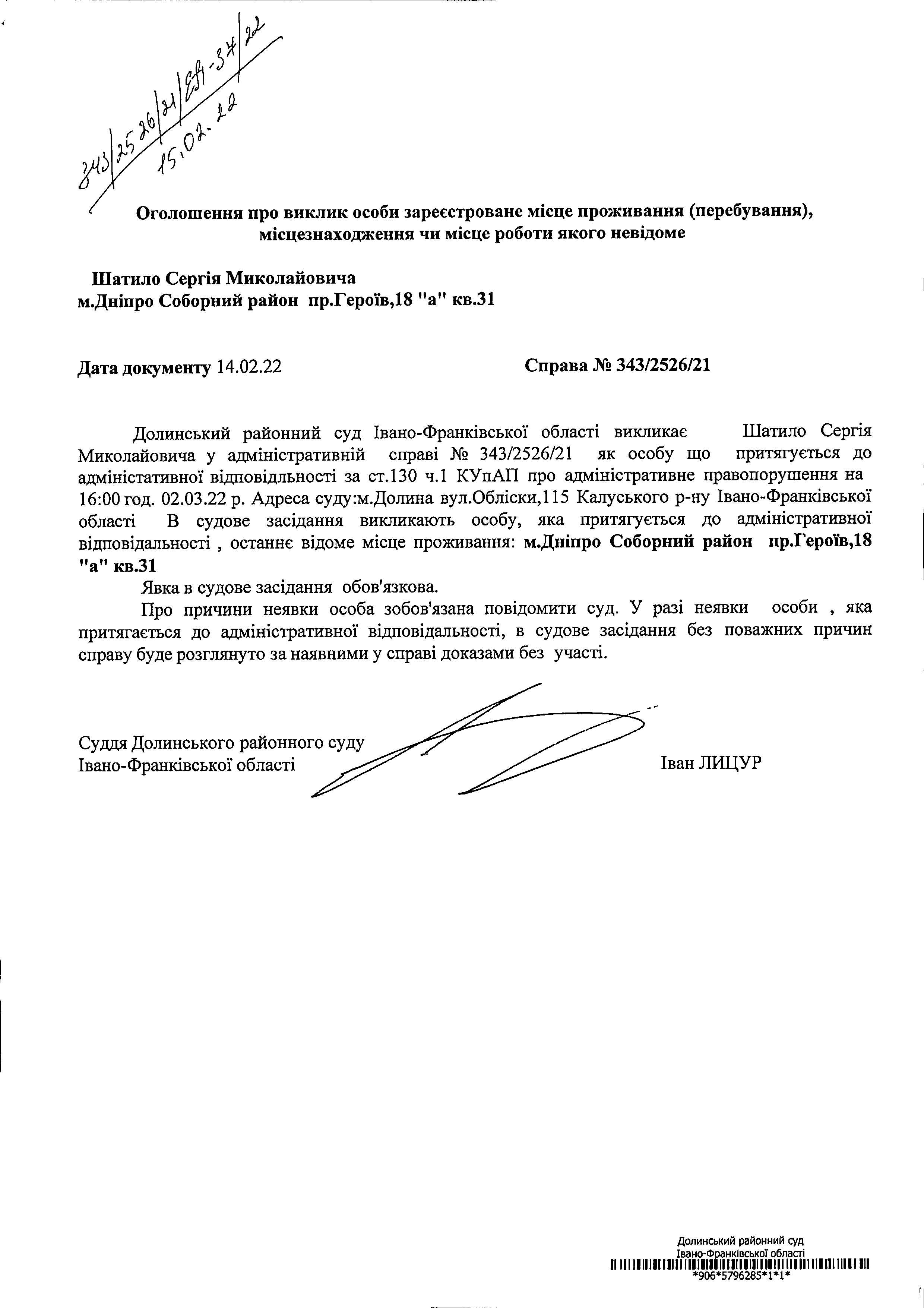 ОГОЛОШЕННЯ ПРО ВИКЛИК до СУДУ Шатило Сергія Миколайовича у справі про адміністративне правопорушення № 343/2526/21