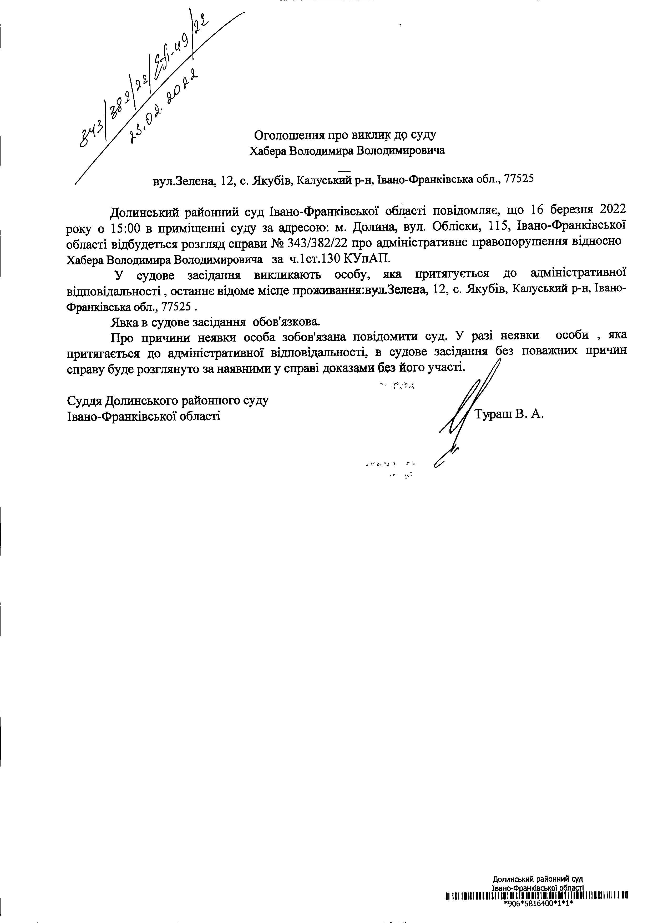 ОГОЛОШЕННЯ ПРО ВИКЛИК до СУДУ Хабера Володимира Володимировича у справі про адміністративне правопорушення № 343/382/22