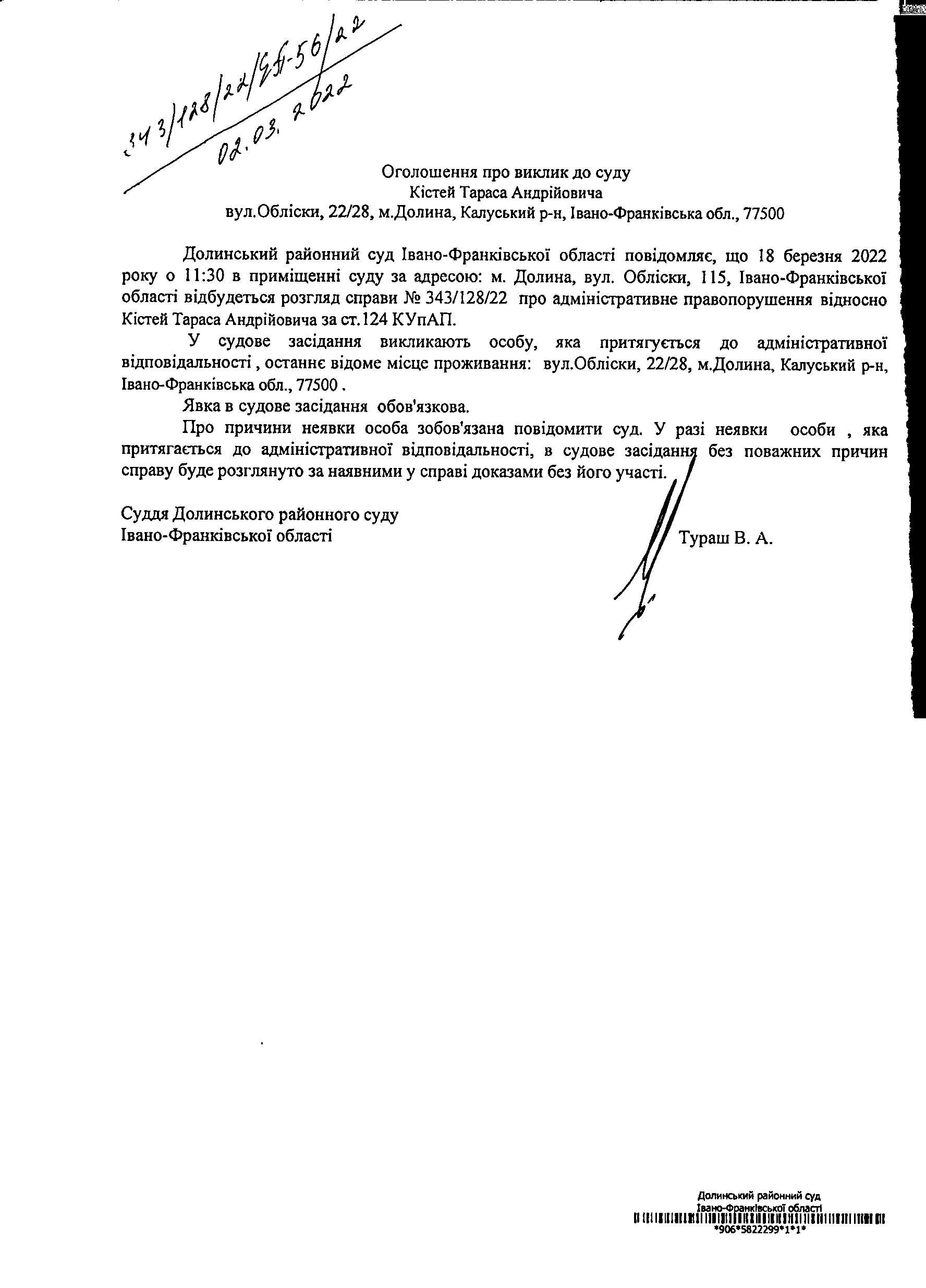 ОГОЛОШЕННЯ ПРО ВИКЛИК до СУДУ Кістей Тараса Андрійовича у справі про адміністративне правопорушення № 343/128/22