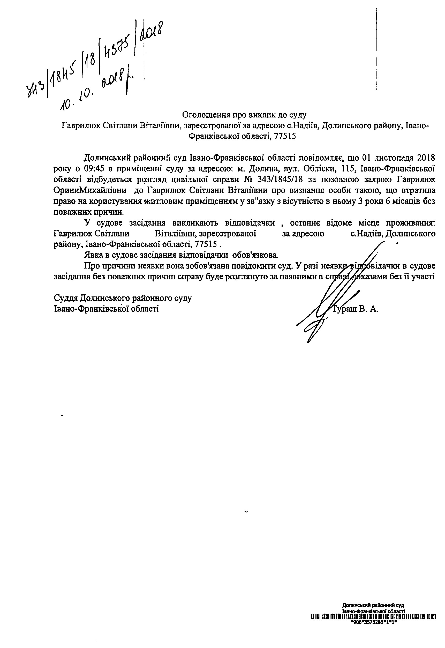ОГОЛОШЕННЯ ПРО ВИКЛИК до СУДУ Гаврилюк Світлани Віталіївни в цивільній справі № 343/1845/18