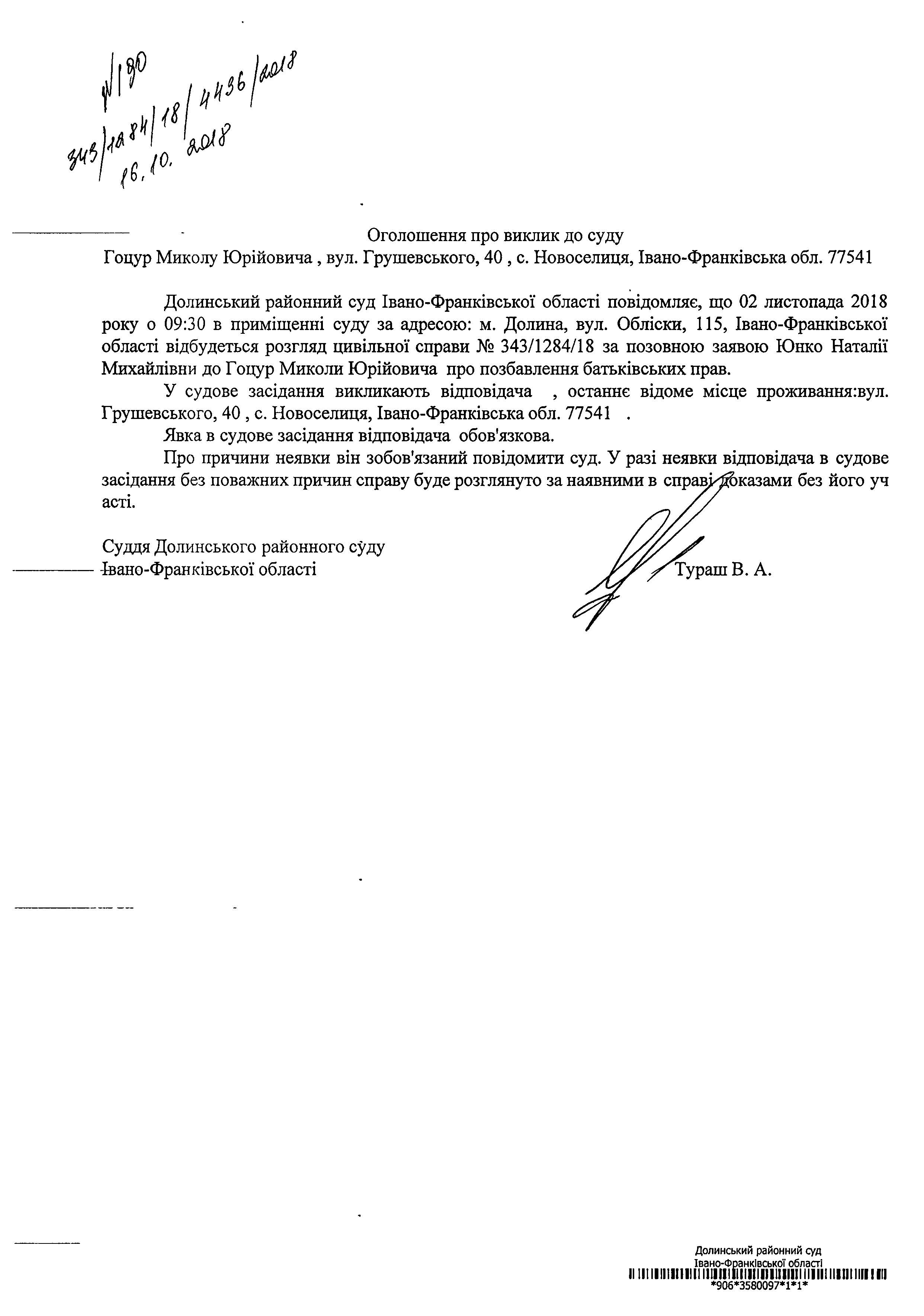 Оголошення про виклик до суду Гоцур Миколи Юрійовича по справі №343/1284/18