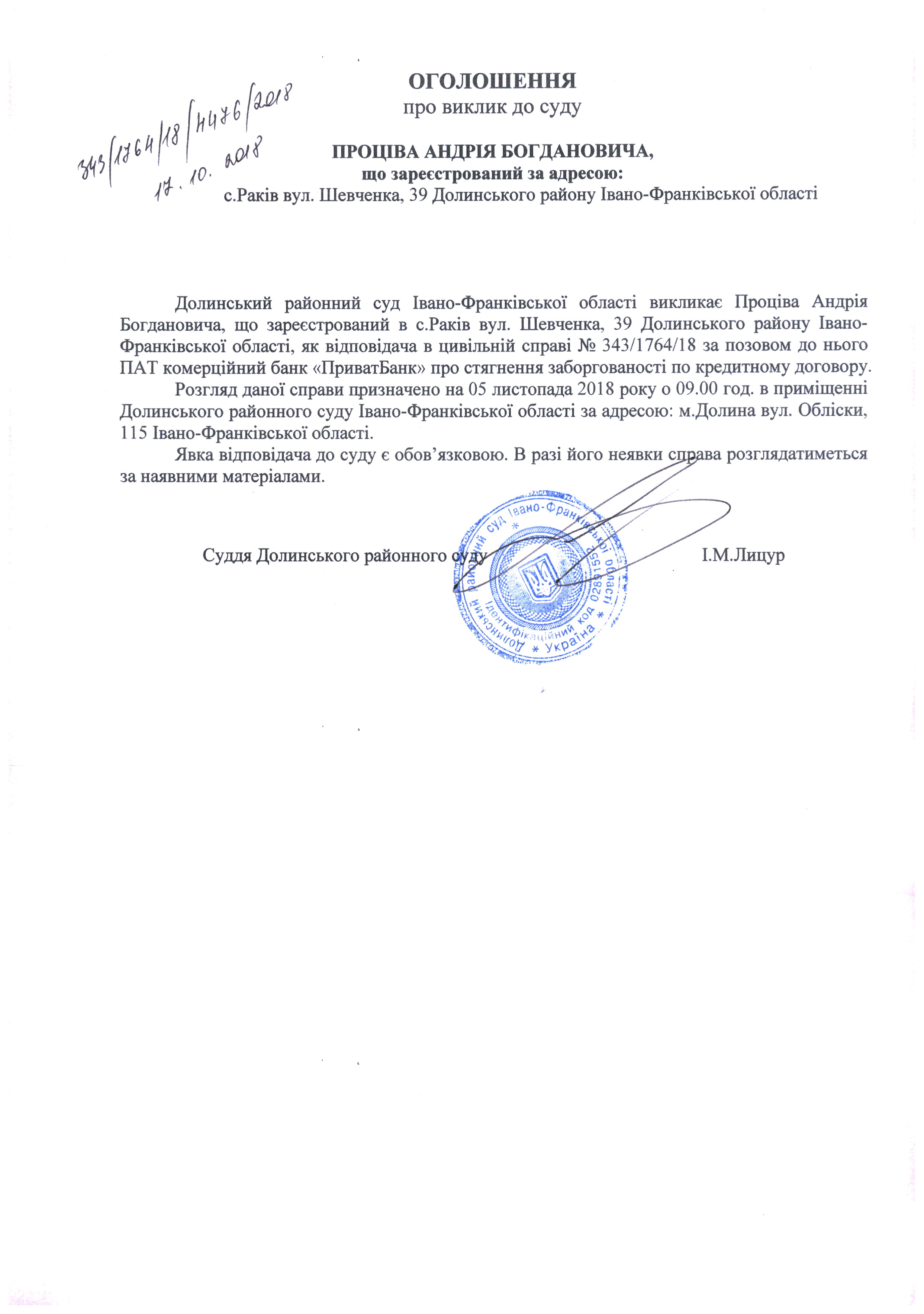 ОГОЛОШЕННЯ ПРО ВИКЛИК до СУДУ Проців Андрія Богдановича в цивільній справі № 343/1764/18