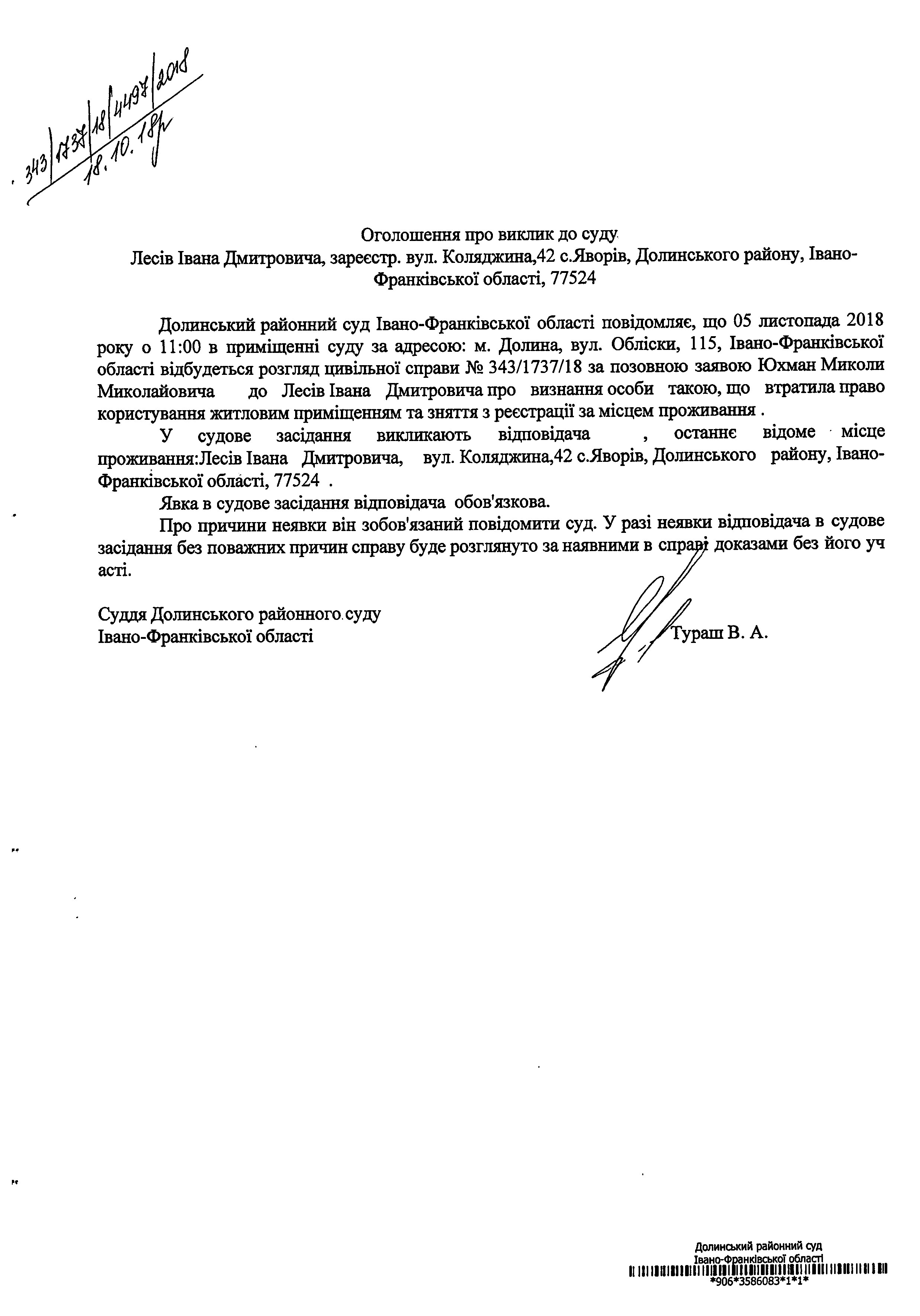 ОГОЛОШЕННЯ ПРО ВИКЛИК до СУДУ Лесів Івана Дмитровича в цивільній справі № 343/1737/18