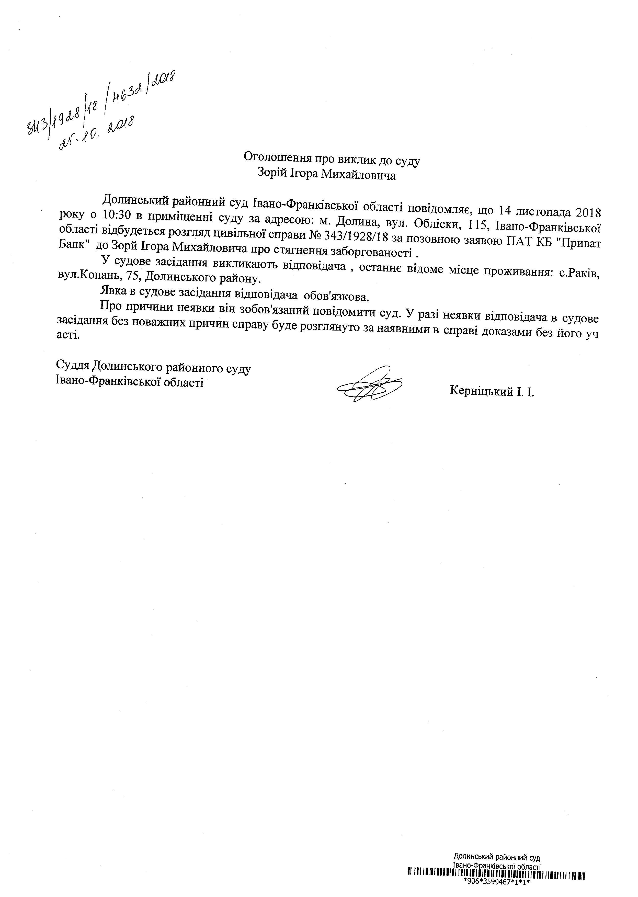 ОГОЛОШЕННЯ ПРО ВИКЛИК до СУДУ Зорій Ігора Михайловича в цивільній справі № 343/1928/18