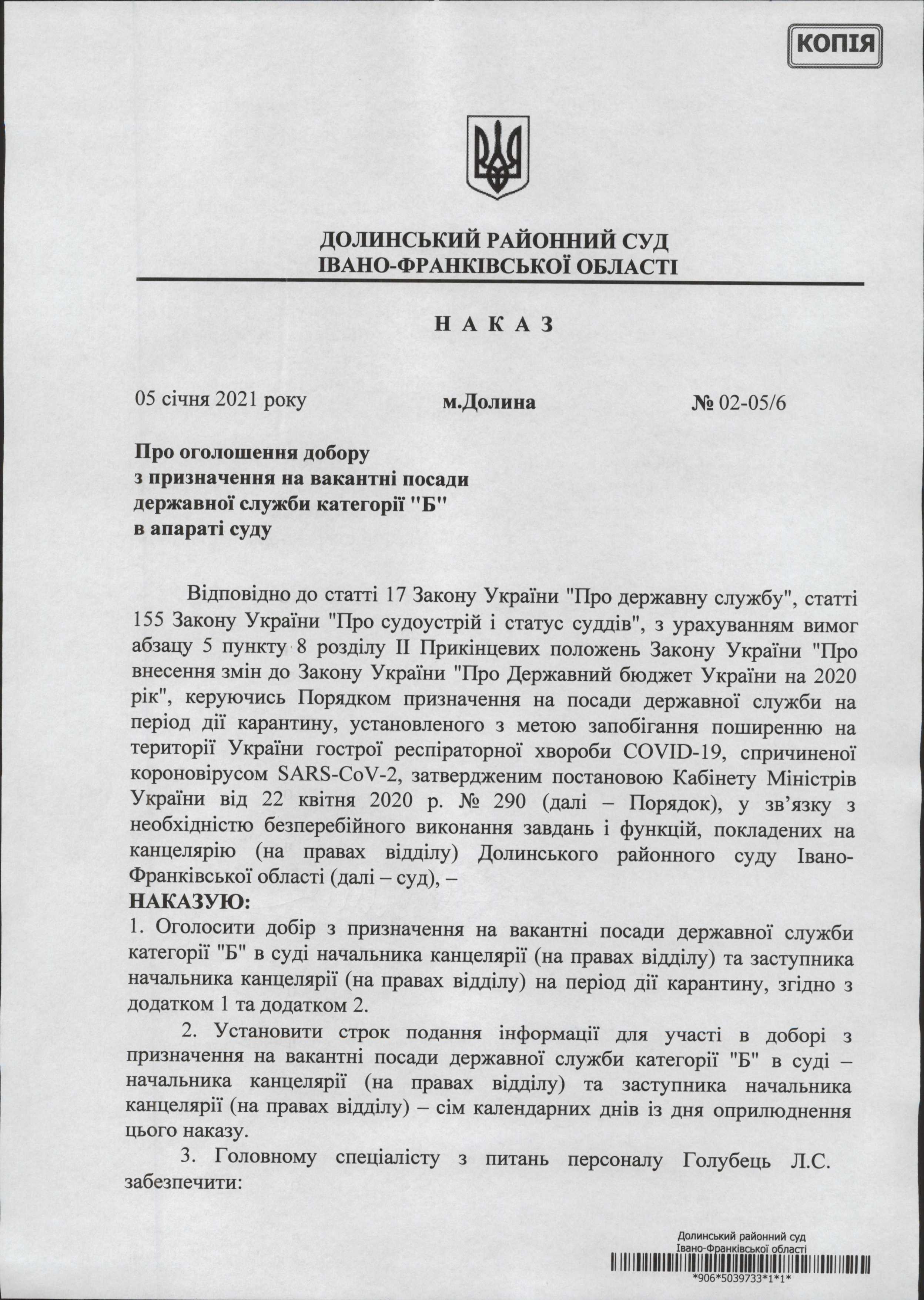 Долинський районний суд Івано-Франківської області, що знаходиться за адресою: м.Долина, вул.Обліски,115 оголошує добір з призначення на вакантні посади державної служби категорії "Б": начальника канцелярії (на правах відділу) та заступника начальника канцелярії (на правах відділу)
