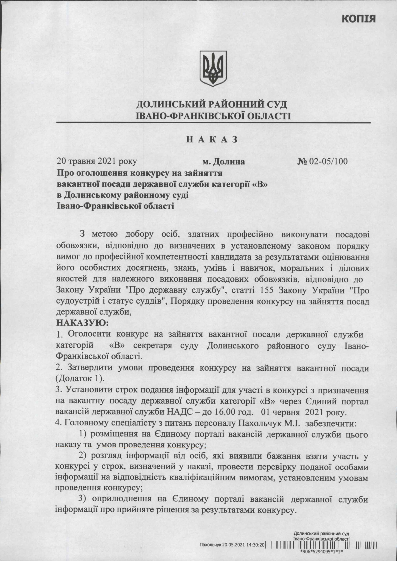 Оголошення про проведення конкурсу на зайняття вакантної посади