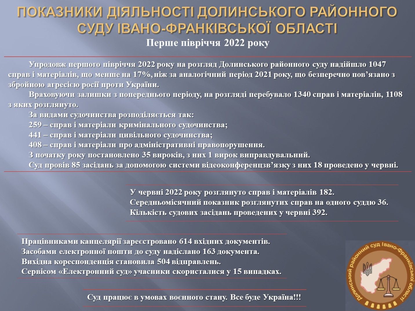 Інформуємо про діяльність Долинського районного суду Івано-Франківської області у першому півріччі 2022 року
