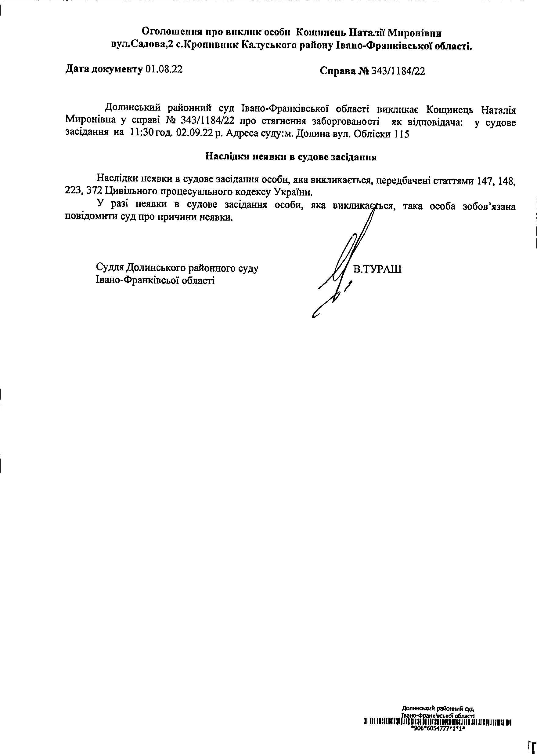ОГОЛОШЕННЯ ПРО ВИКЛИК до СУДУ Кощинець Наталії Миронівни у справі № 343/1184/22