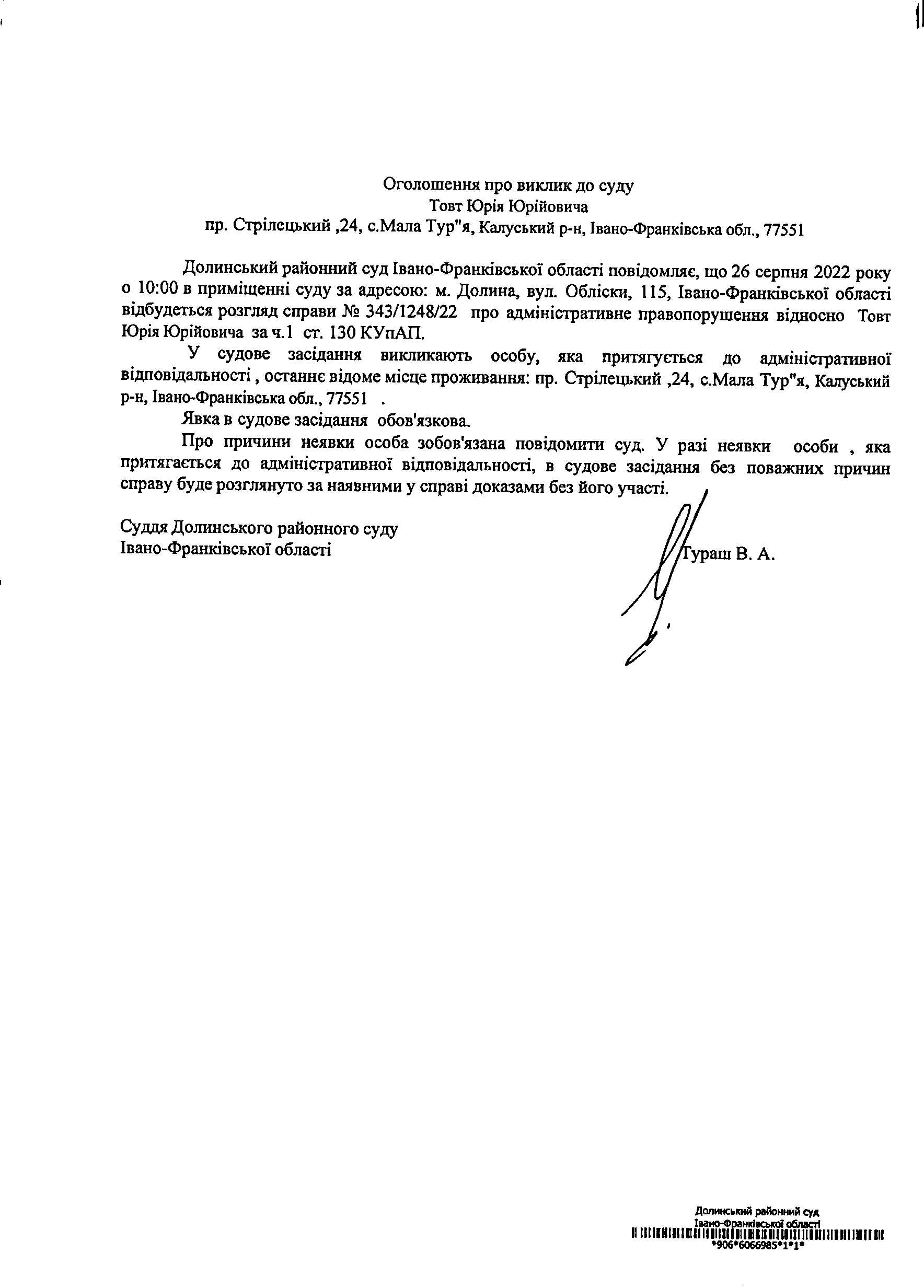ОГОЛОШЕННЯ ПРО ВИКЛИК до СУДУ Товт Юрія Юрійовича у справі про адміністративне правопорушення № 343/1248/22