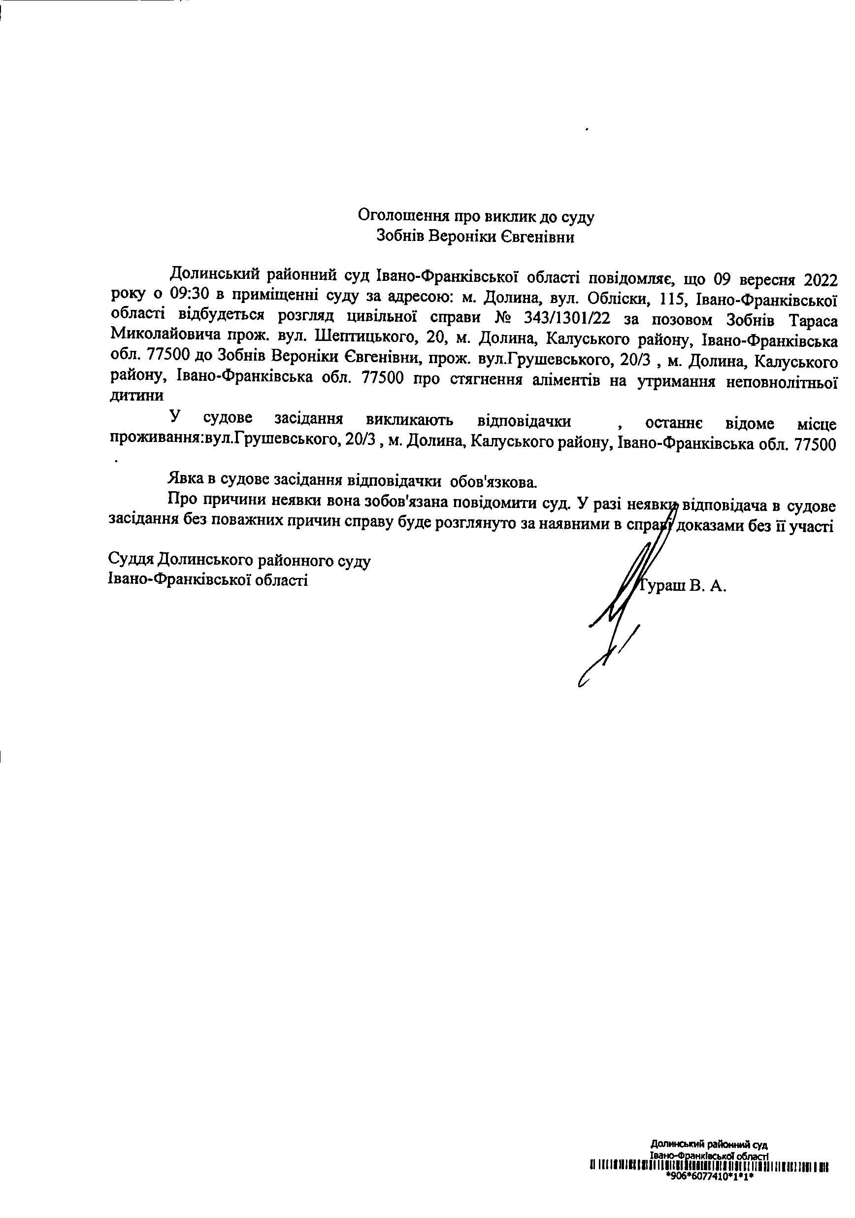 ОГОЛОШЕННЯ ПРО ВИКЛИК до СУДУ Зобнів Вероніки Євгенівни у справі № 343/1301/22
