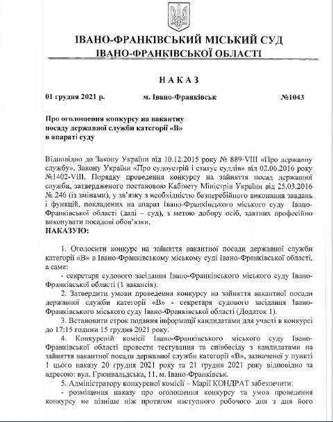 Наказ про оголошення конкурсу з призначення на вакантні посади державної служби категорії "В" в апараті суду