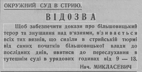 За спогадами онука судді о. Зиновія Микласевича, його дід задокументував свідчення жертв більшовицької влади, дані документи деякий час зберігала донька судді Ксенія, однак вона була змушена їх знищити, оскільки побоювалася переслідування з боку радянської влади.