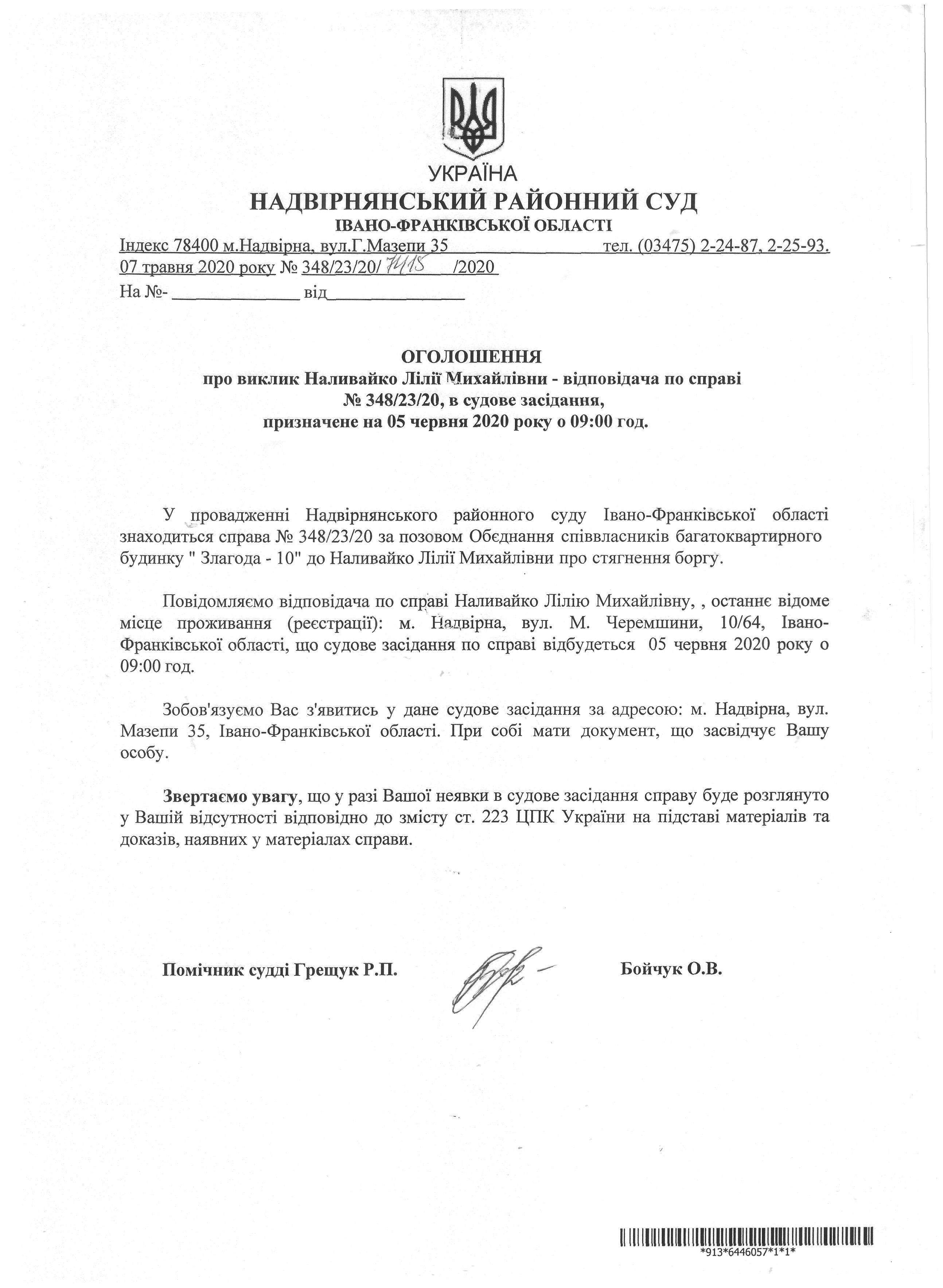 Оголошення про виклик до до суду Наливайко Лілії Михайлівни