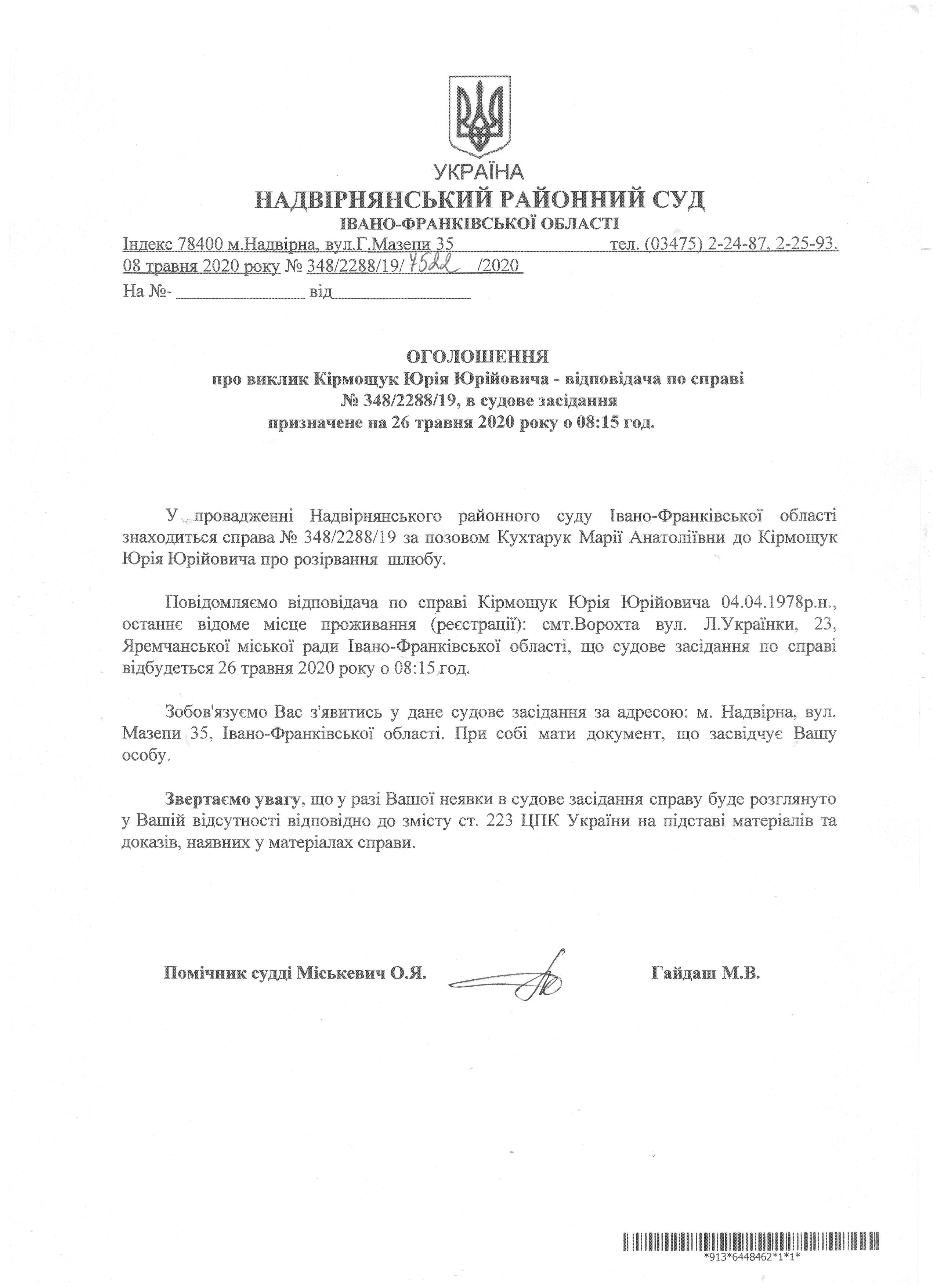 Оголошення про виклик до до суду Кірмощук Юрія Юрійовича
