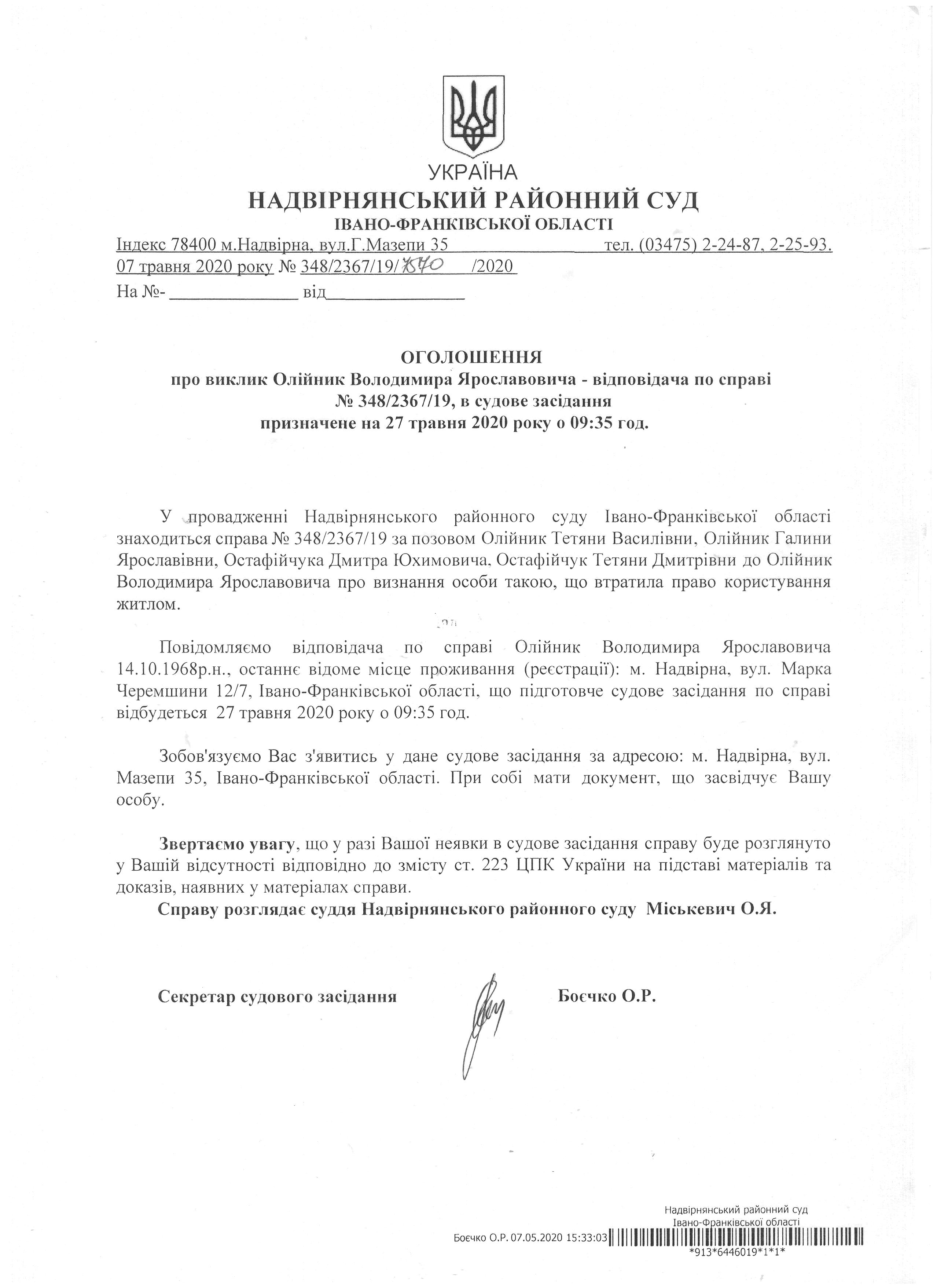 Оголошення про виклик до до суду Олійник Володимира Ярославовича