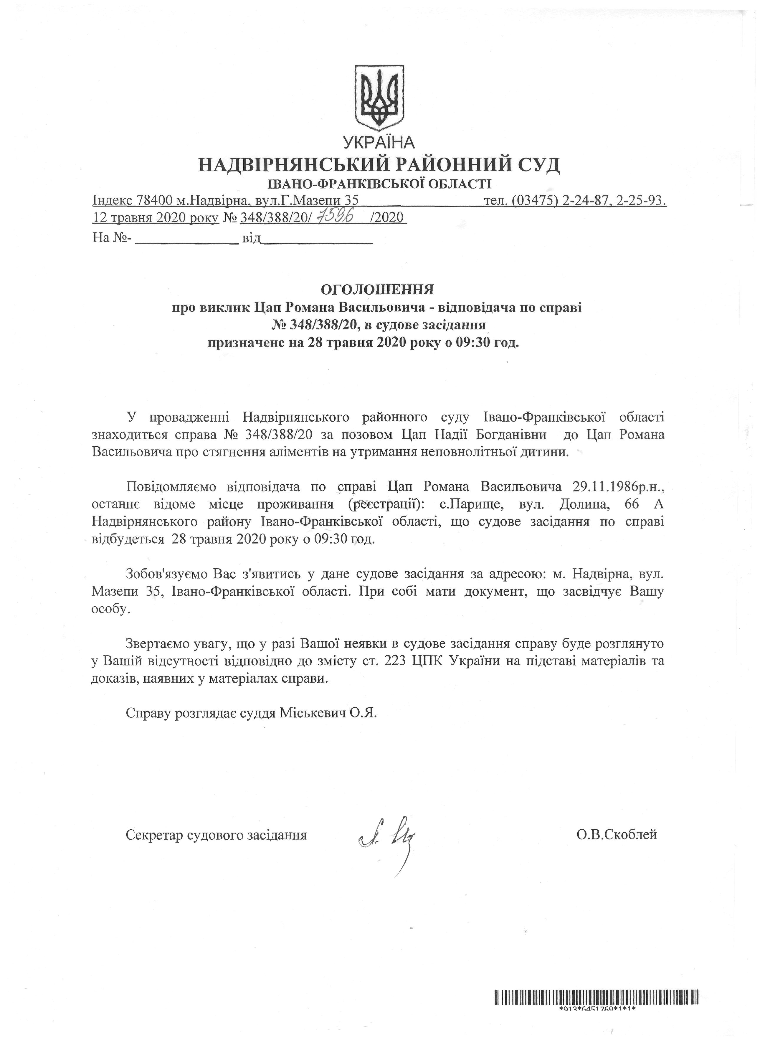 Оголошення про виклик до до суду Цап Романа Васильовича