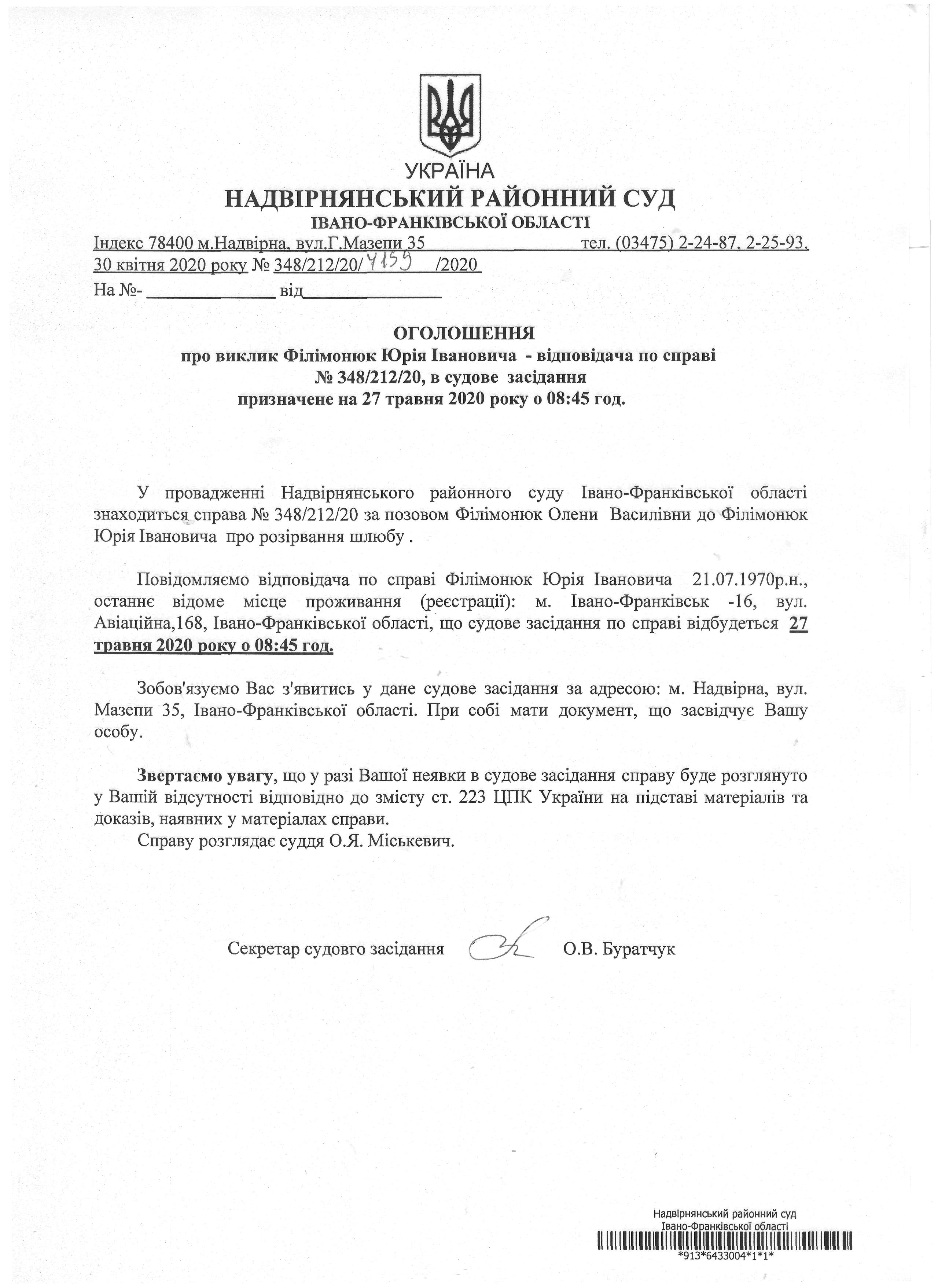 Оголошення про виклик до до суду Філімонюк Юрія Івановича