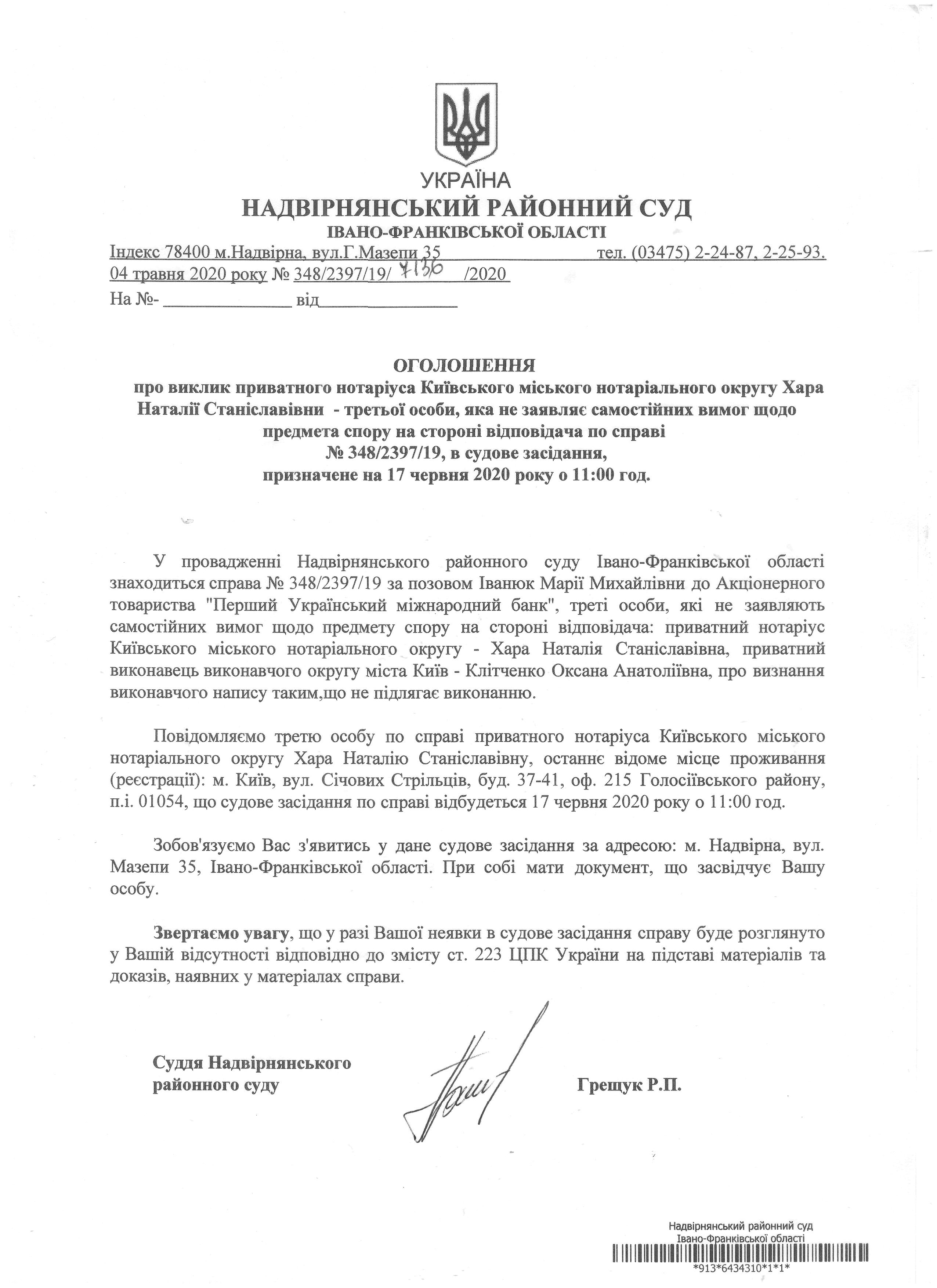 Оголошення про виклик до до суду приватного нотаріуса Київського міського нотаріального округу Хара Наталії Станіславівни