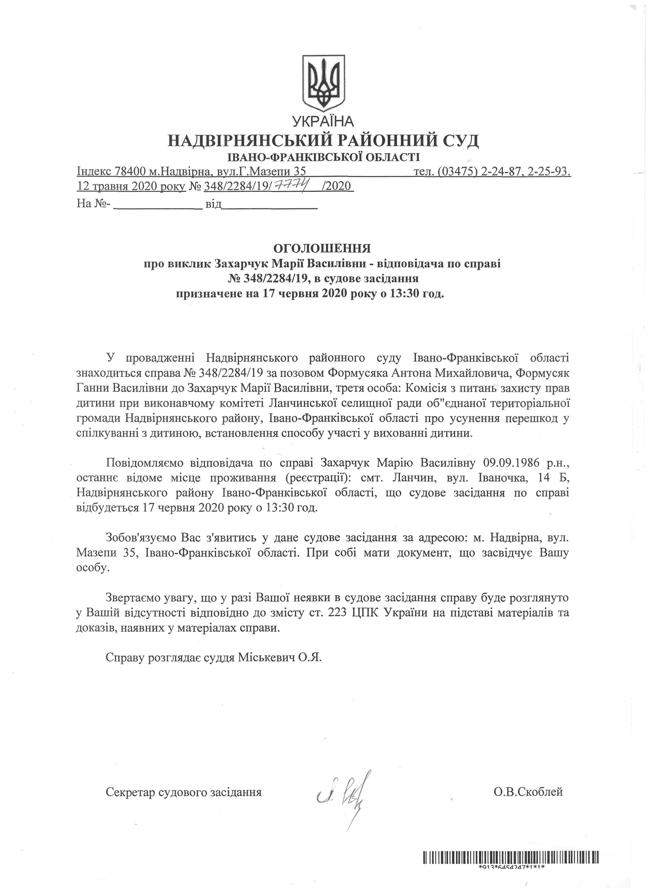 Оголошення про виклик до до суду Захарчук Марії Василівни