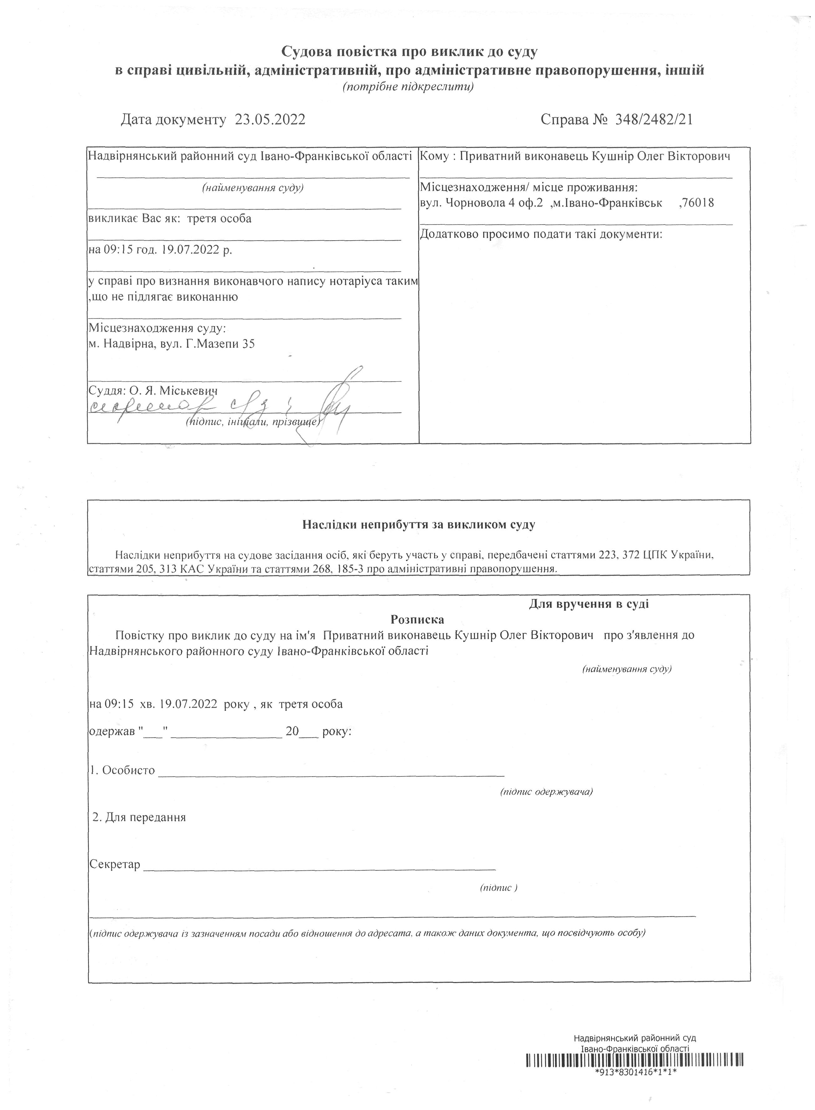 Судова повістка про виклик до суду Приватний виконавець Кушнір Олег Вікторович