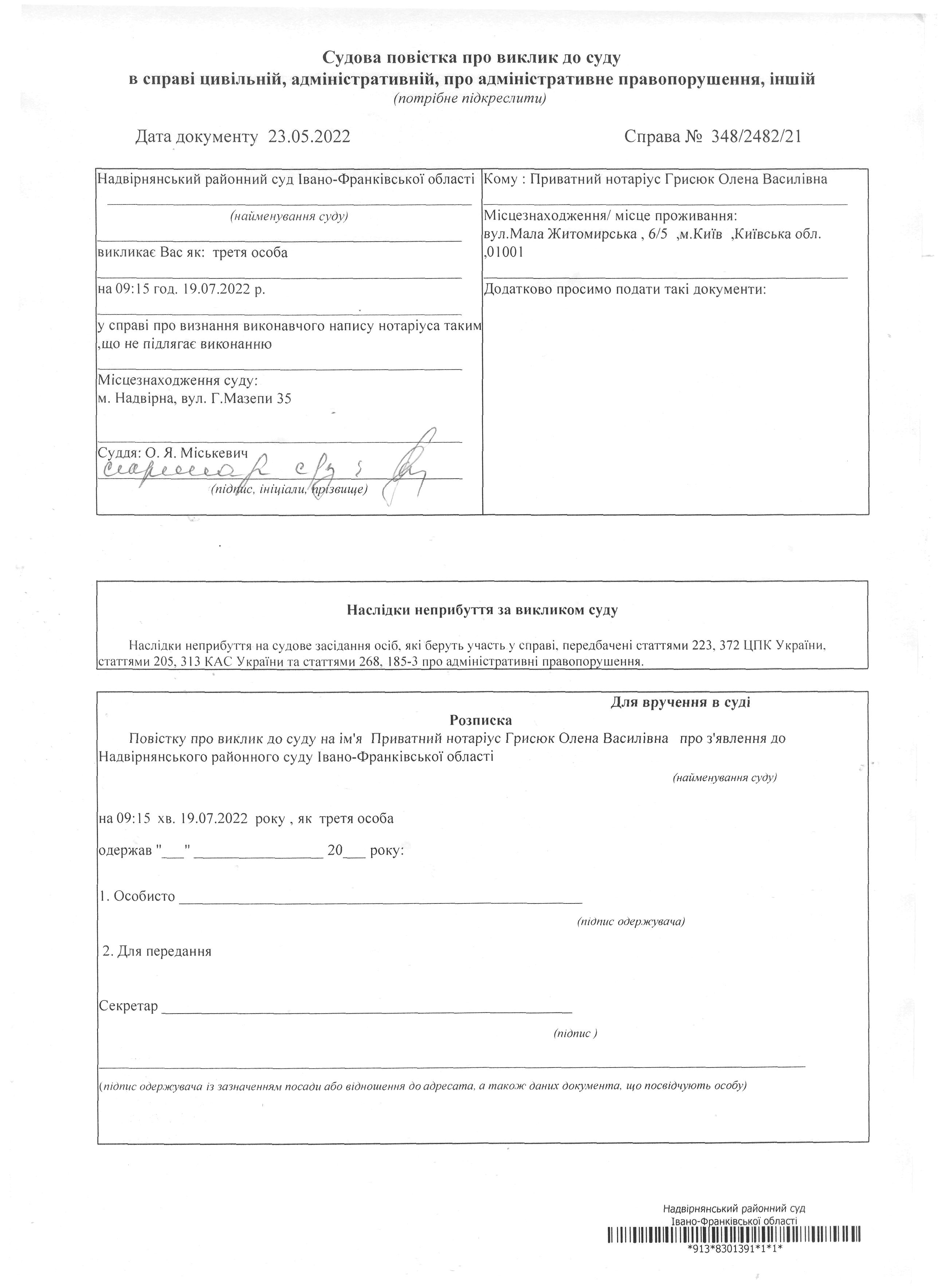Судова повістка про виклик до суду Приватний нотаріус Грисюк Олена Василівна