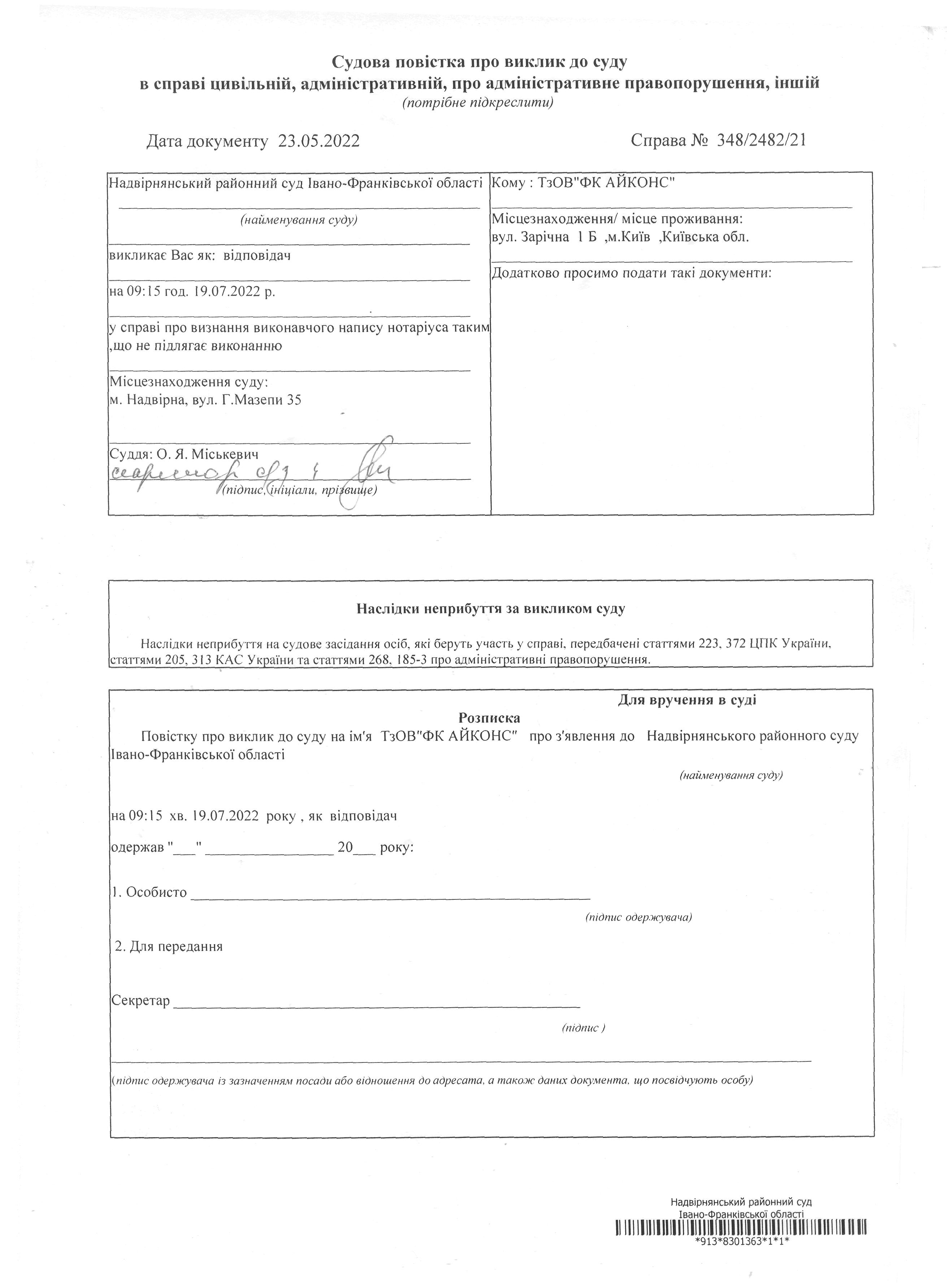Судова повістка про виклик до суду ТзОВ "ФК АйКОНС"