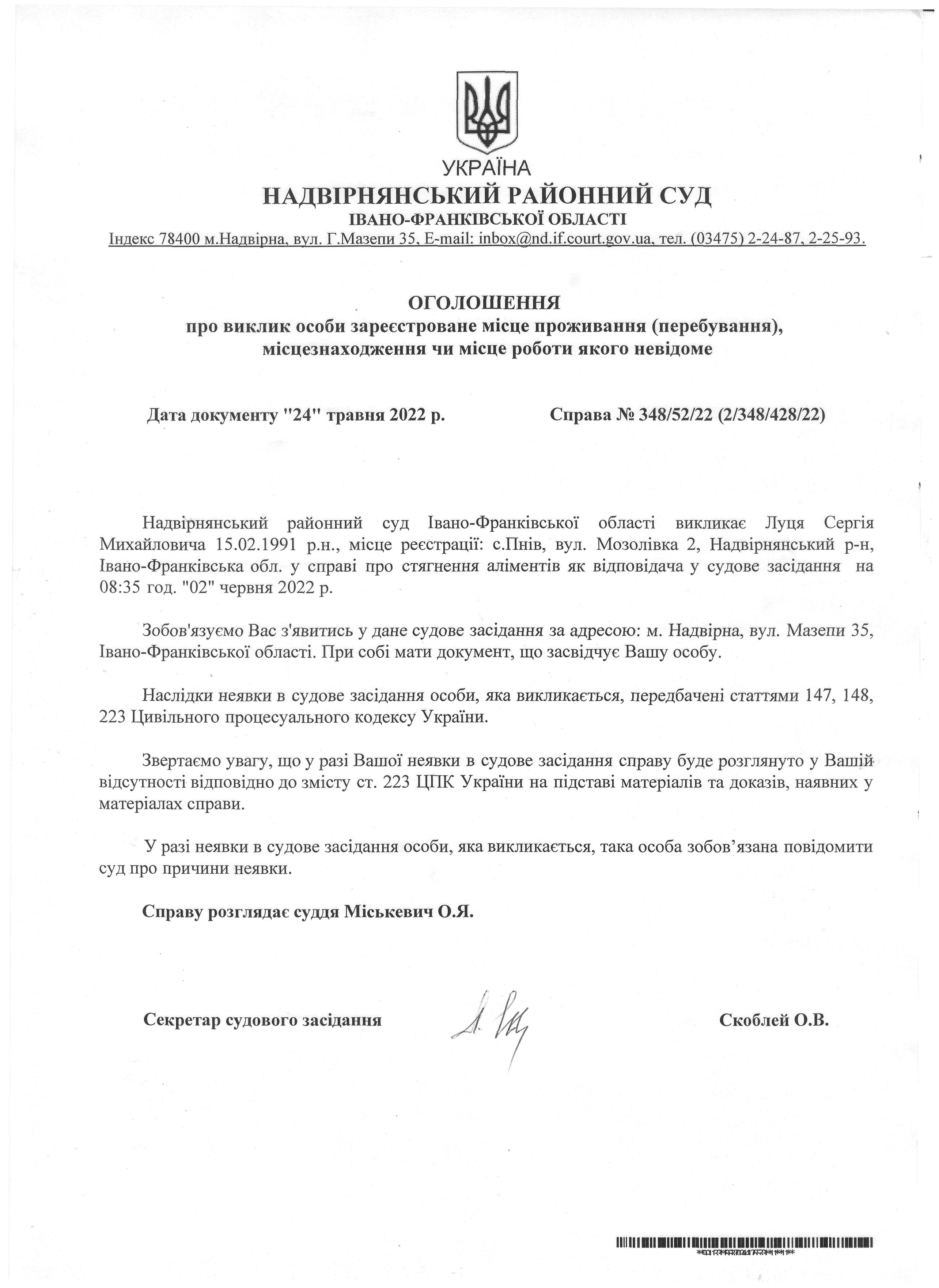 Оголошення про виклик до до суду Луця Сергія Михайловича