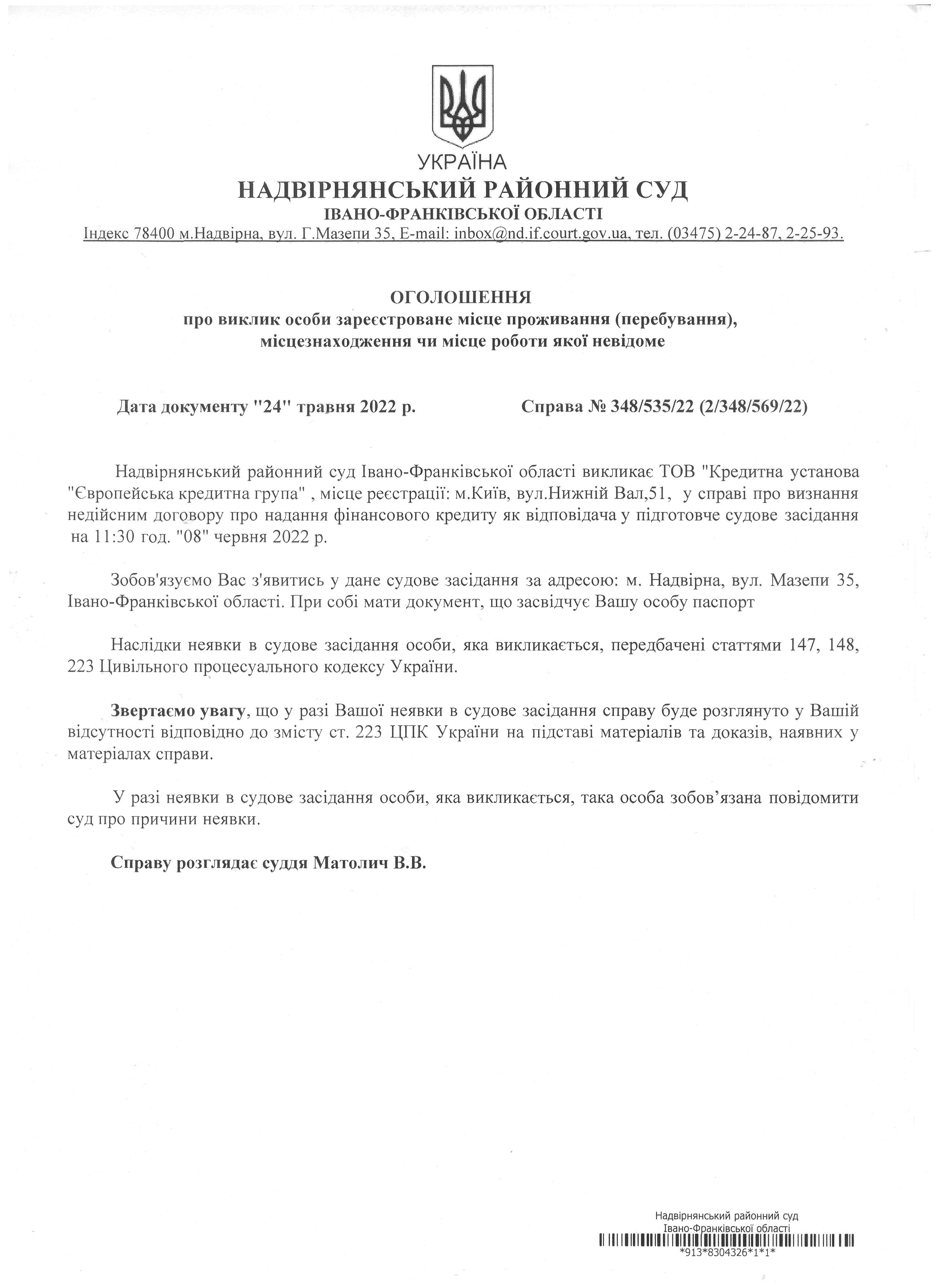 Оголошення про виклик до до суду ТОВ "Кредитна установа "Європейська кредитна група""