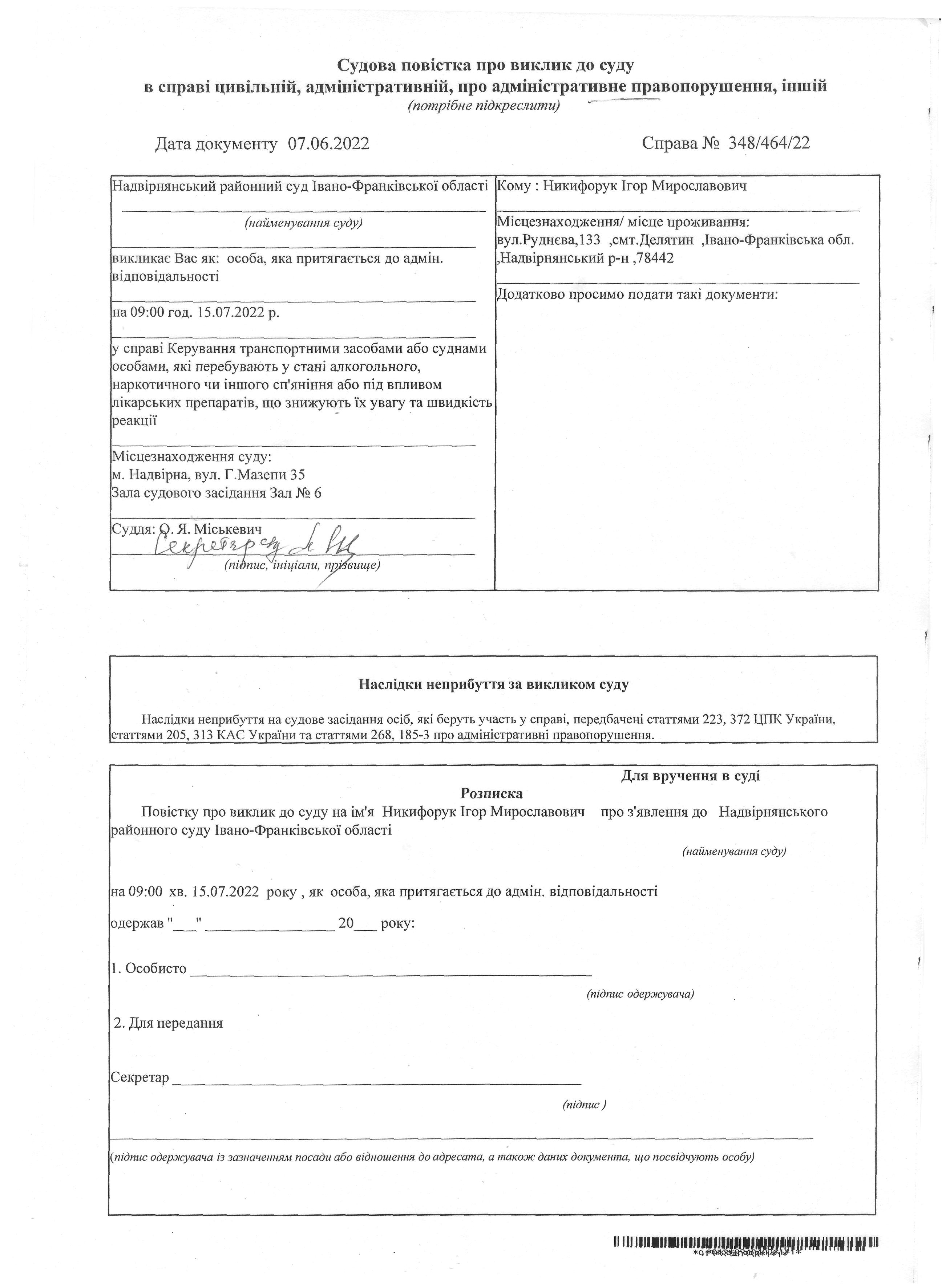 Судова повістка про виклик до суду Никифорук Ігора Мирославовича