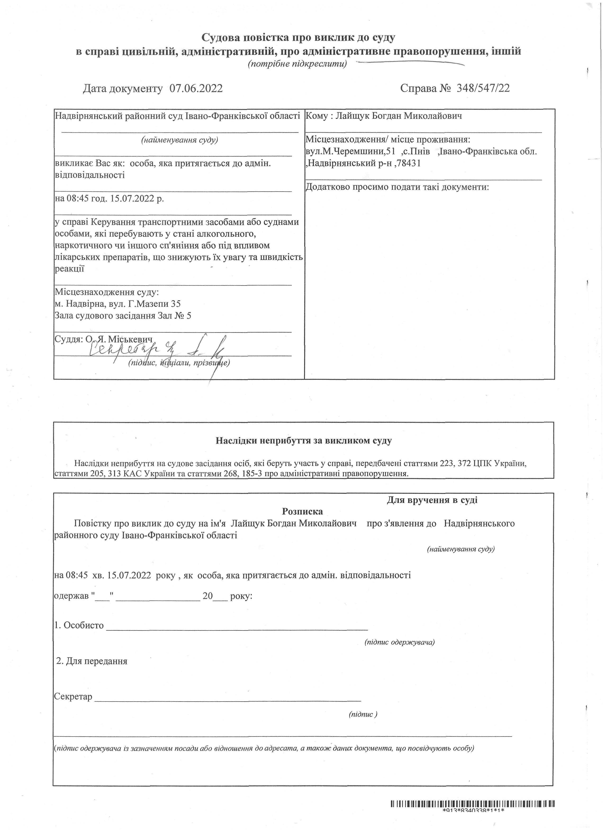 Судова повістка про виклик до суду Лайщук Богдана Миколайовича