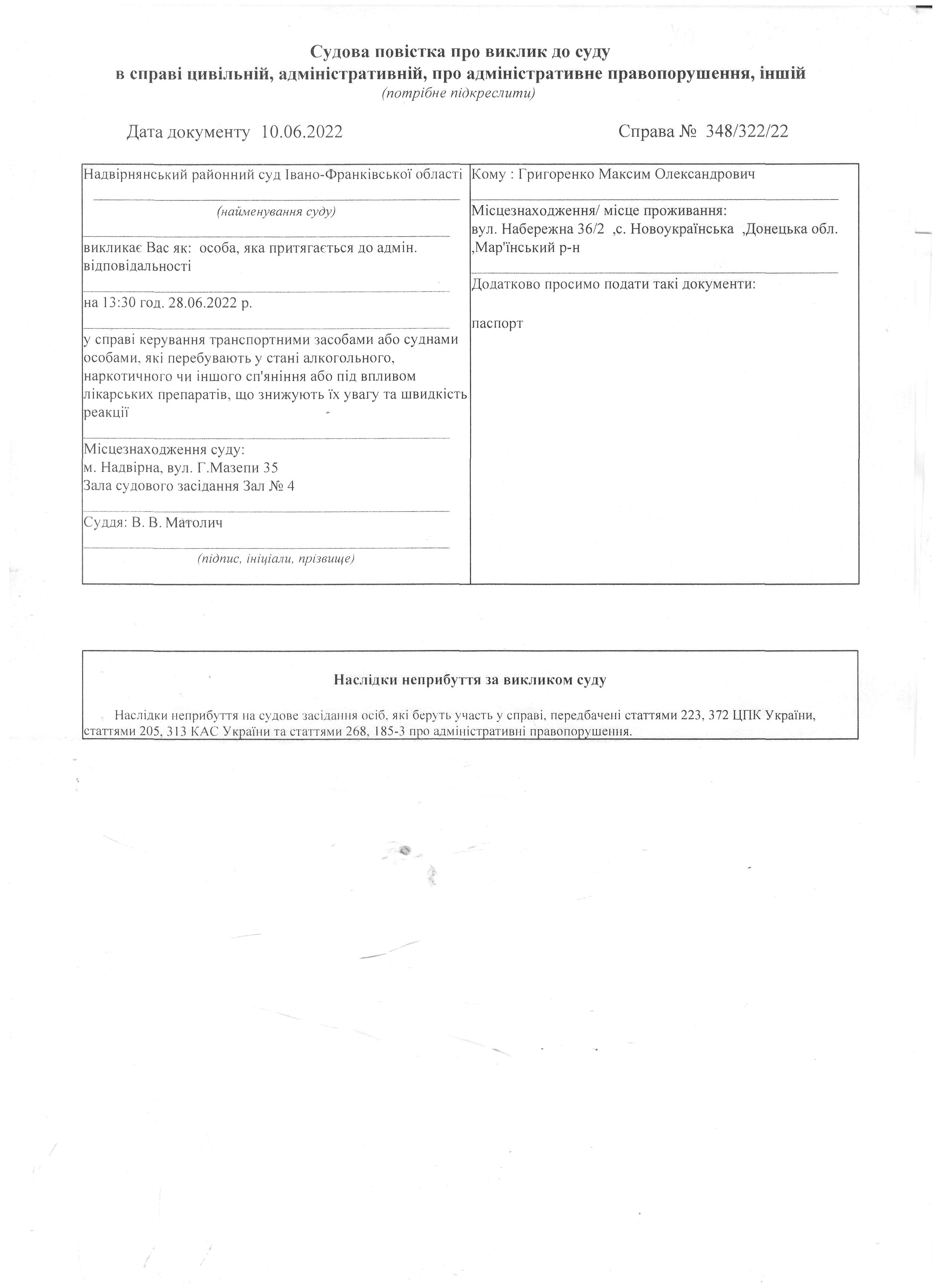 Судова повістка про виклик до суду Григоренко Максим Олександрович