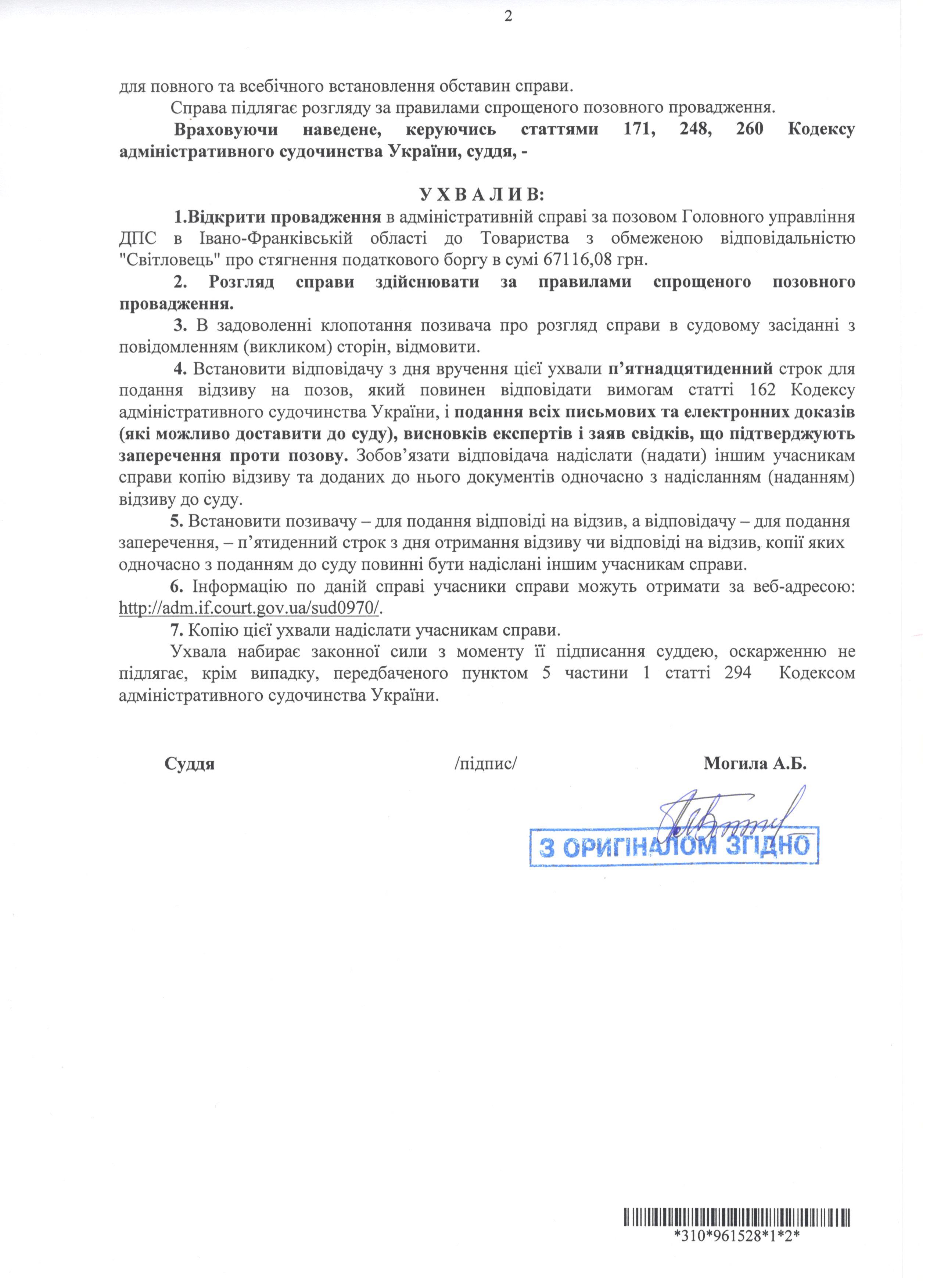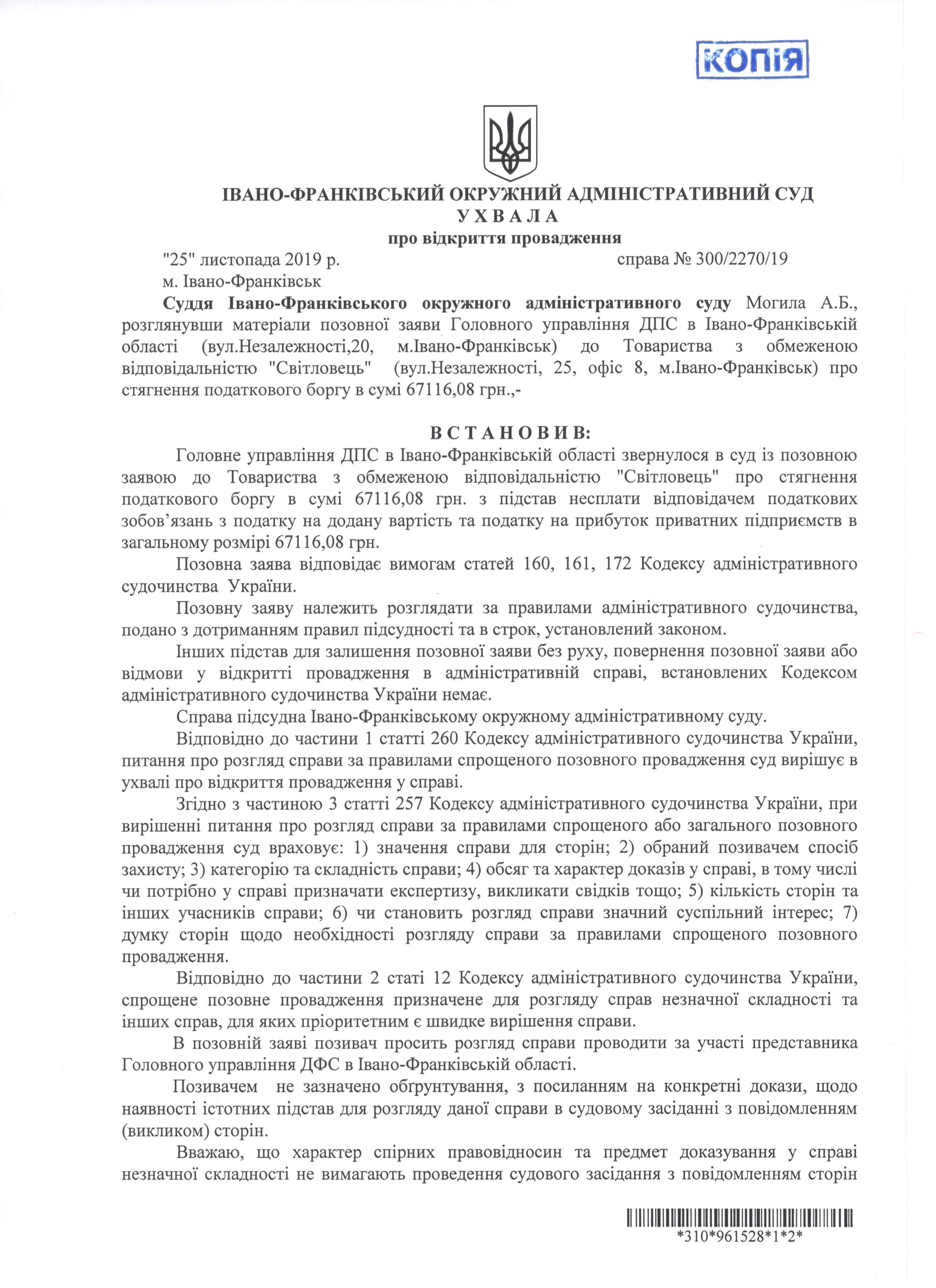Повідомлення про оприлюднення ухвали про відкриття провадження від 25.11.2019 по адміністративній справі № 300/2270/19 про стягнення податкового боргу.