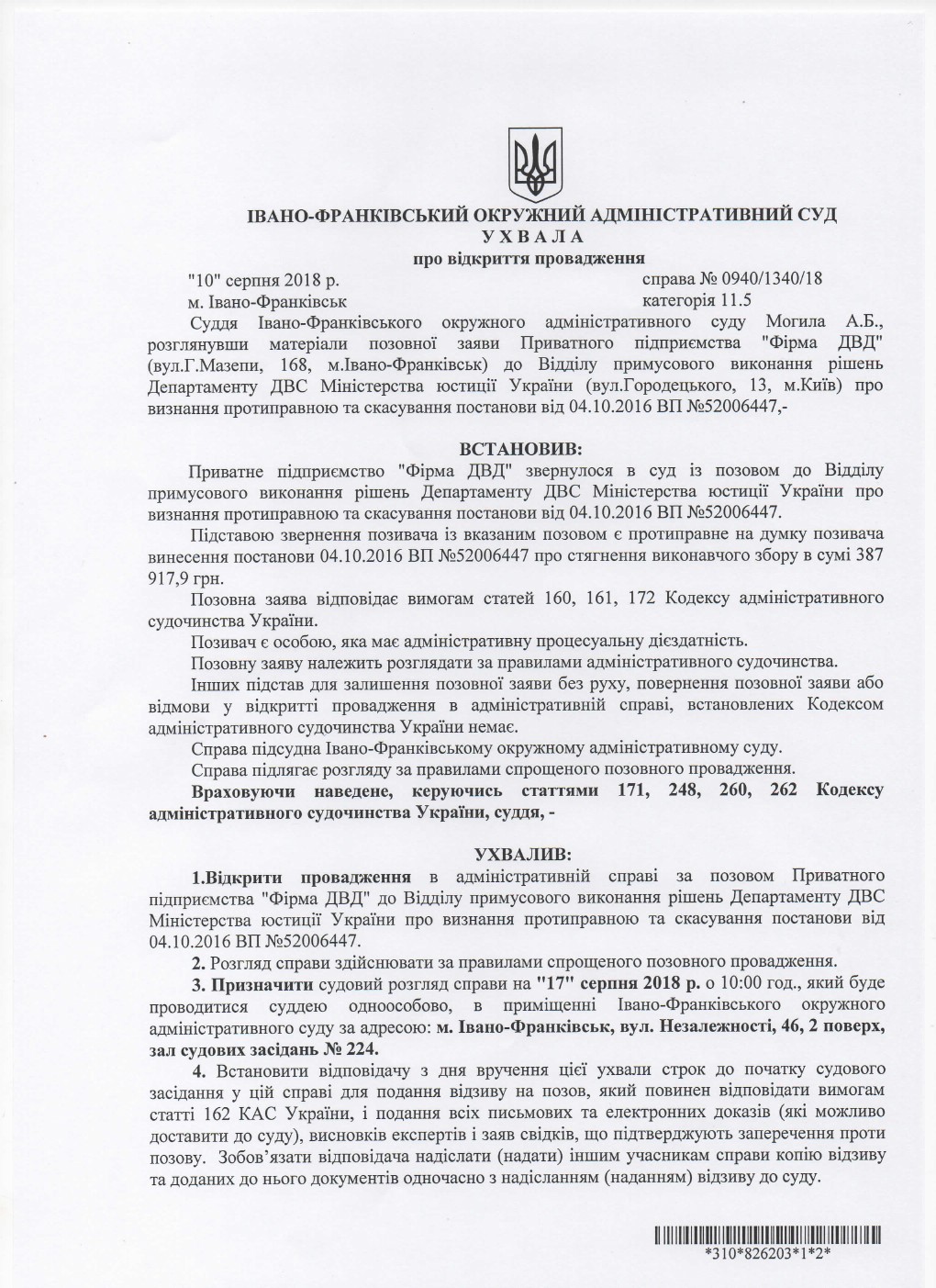Івано-Франківський окружний адміністративний суд повідомляє, що "17" серпня 2018 р. о 10:00 год., в приміщенні Івано-Франківського окружного адміністративного суду за адресою: м. Івано-Франківськ, вул. Незалежності, 46, 2 поверх, зал судових засідань № 224, буде проводитись розгляд справи за позовом Приватного підприємства "Фірма ДВД"(вул.Г.Мазепи, 168, м.Івано-Франківськ) до Відділу примусового виконання рішень Департаменту ДВС Міністерства юстиції України (вул.Городецького, 13, м.Київ) про визнання протиправною та скасування постанови від 04.10.2016 ВП №52006447.