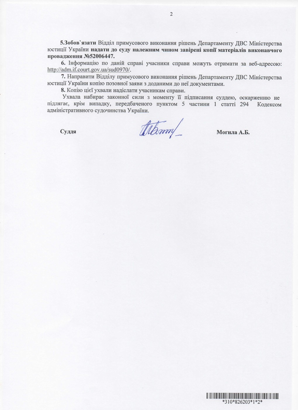 Одночасно звертаємо увагу відповідача, що згідно ухвали про відкриття провадження в справі від 10 серпня 2018 року зобов`язано Відділ примусового виконання рішень Департаменту ДВС Міністерства юстиції України надати до суду належним чином завірені копії матеріалів виконавчого провадження №52006447.