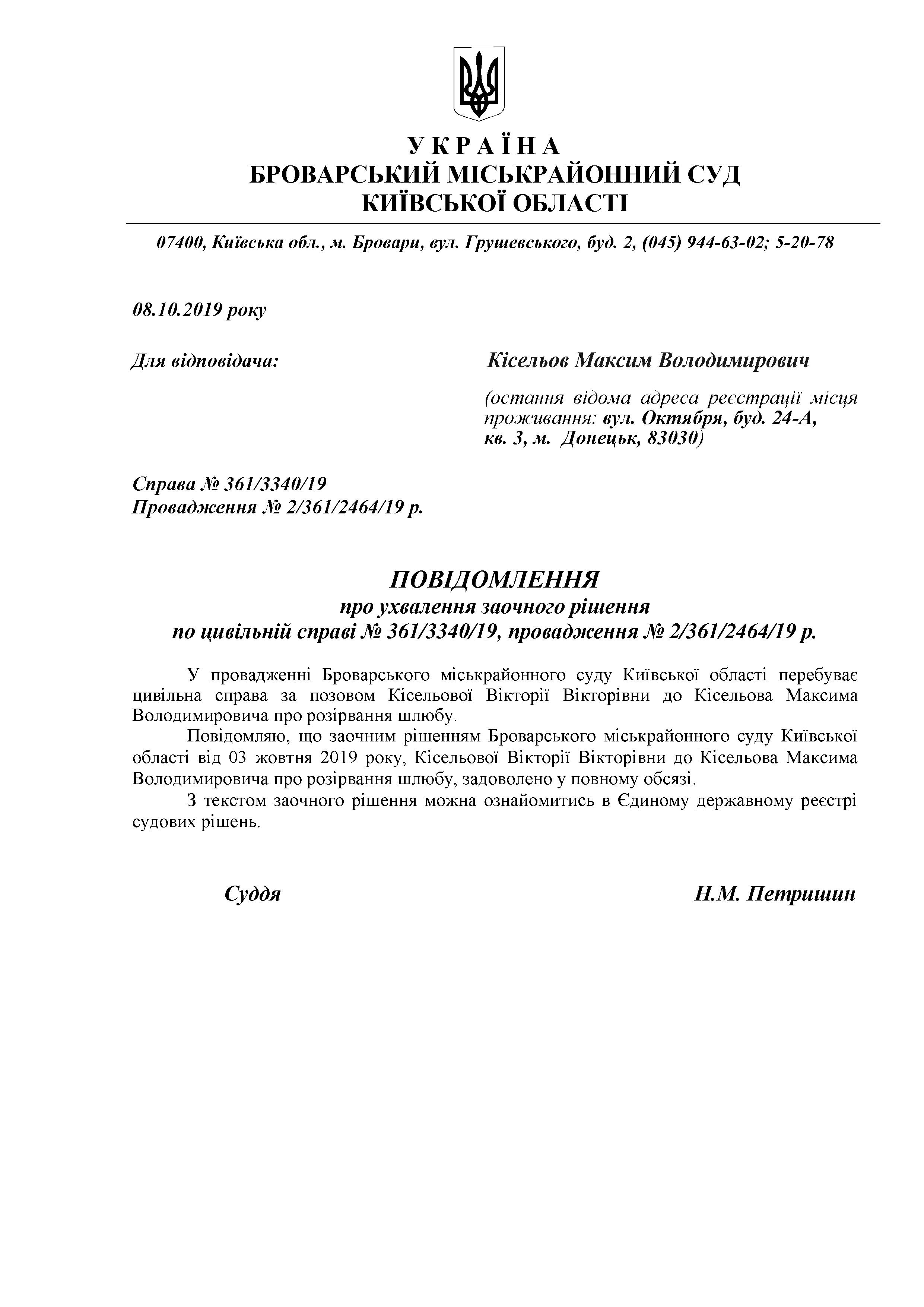 ПОВІДОМЛЕННЯ про ухвалення заочного рішення по цивільній справі № 361/3340/19, провадження № 2/361/2464/19 р.