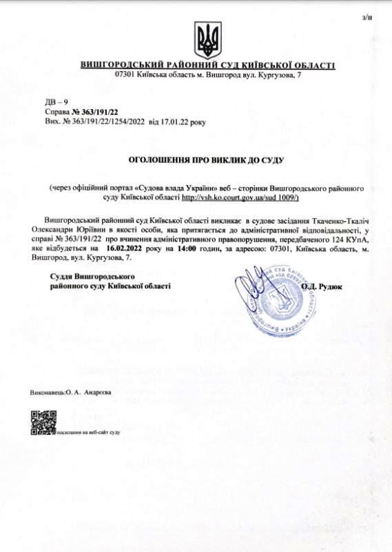 Оголошення про виклик до суду по справі № 363/191/22