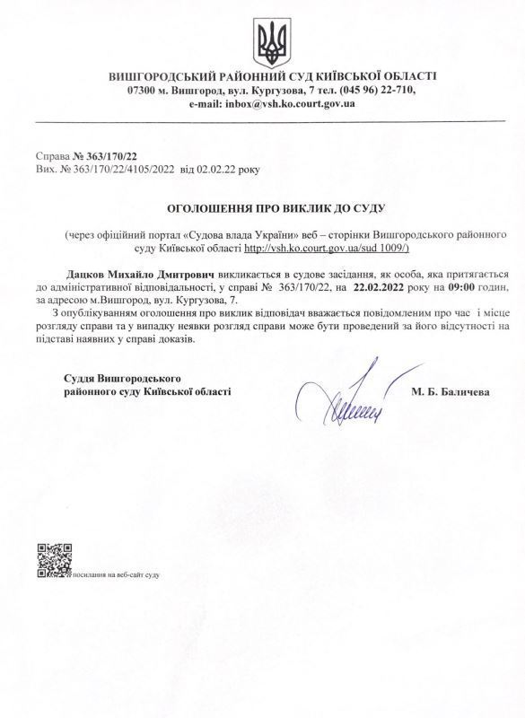 Оголошення про виклик до суду по справі № 363/170/22