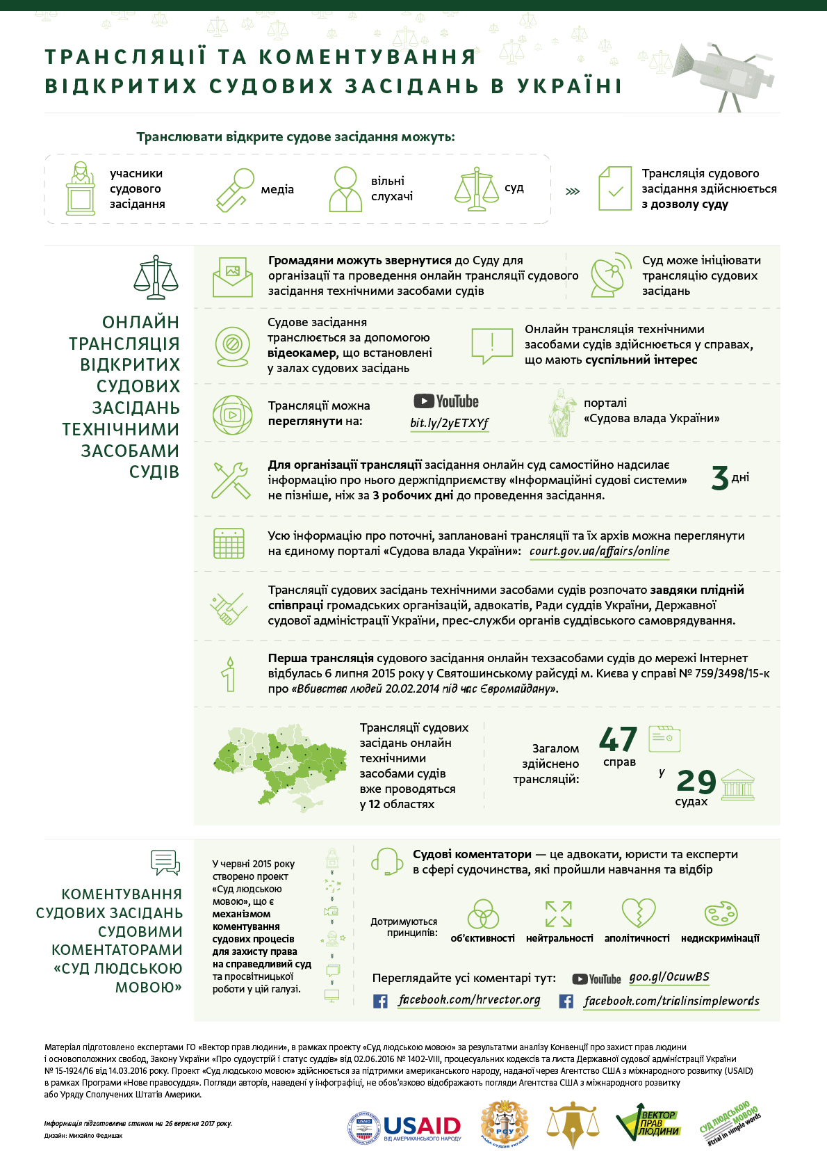 Для поширення серед учасників (потенційних учасників) судових засідань, вільних слухачів та медіа – ГО «Вектор прав людини», проекту «Суд людською мовою» розробили інфографіку «Трансляції та коментування відкритих судових засідань в Україні».