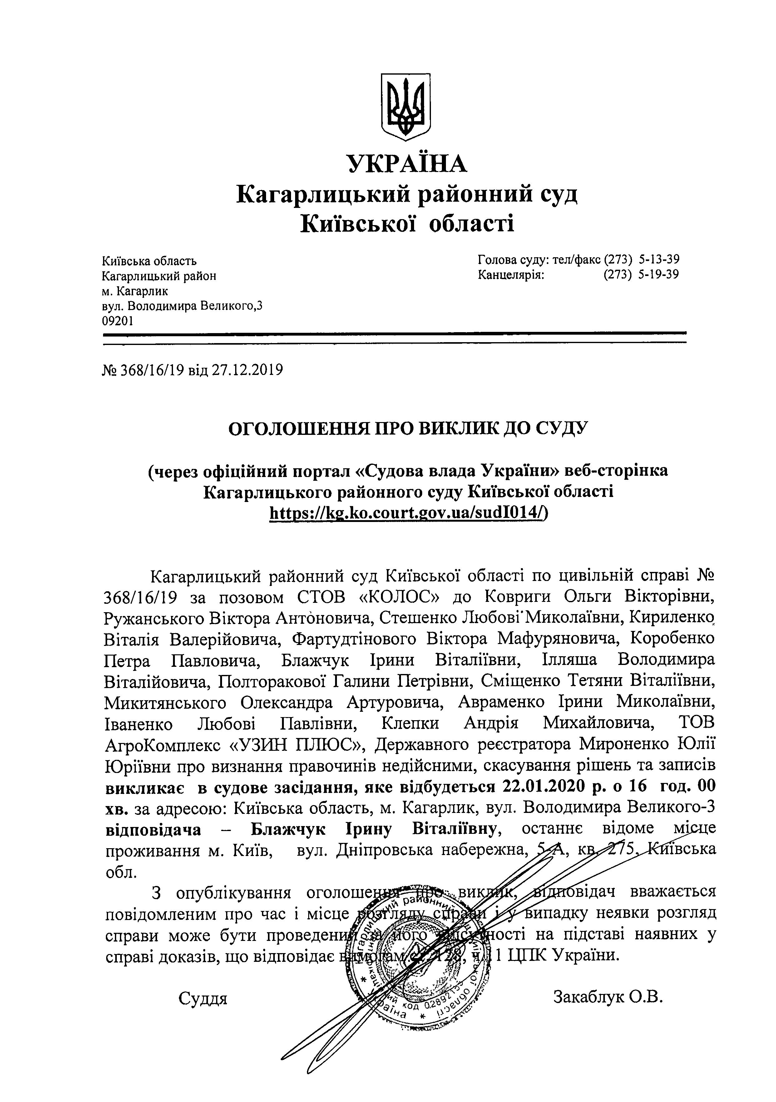 Виклик до суду Блажчук Ірину Віталіївну на 22.01.2020 р.