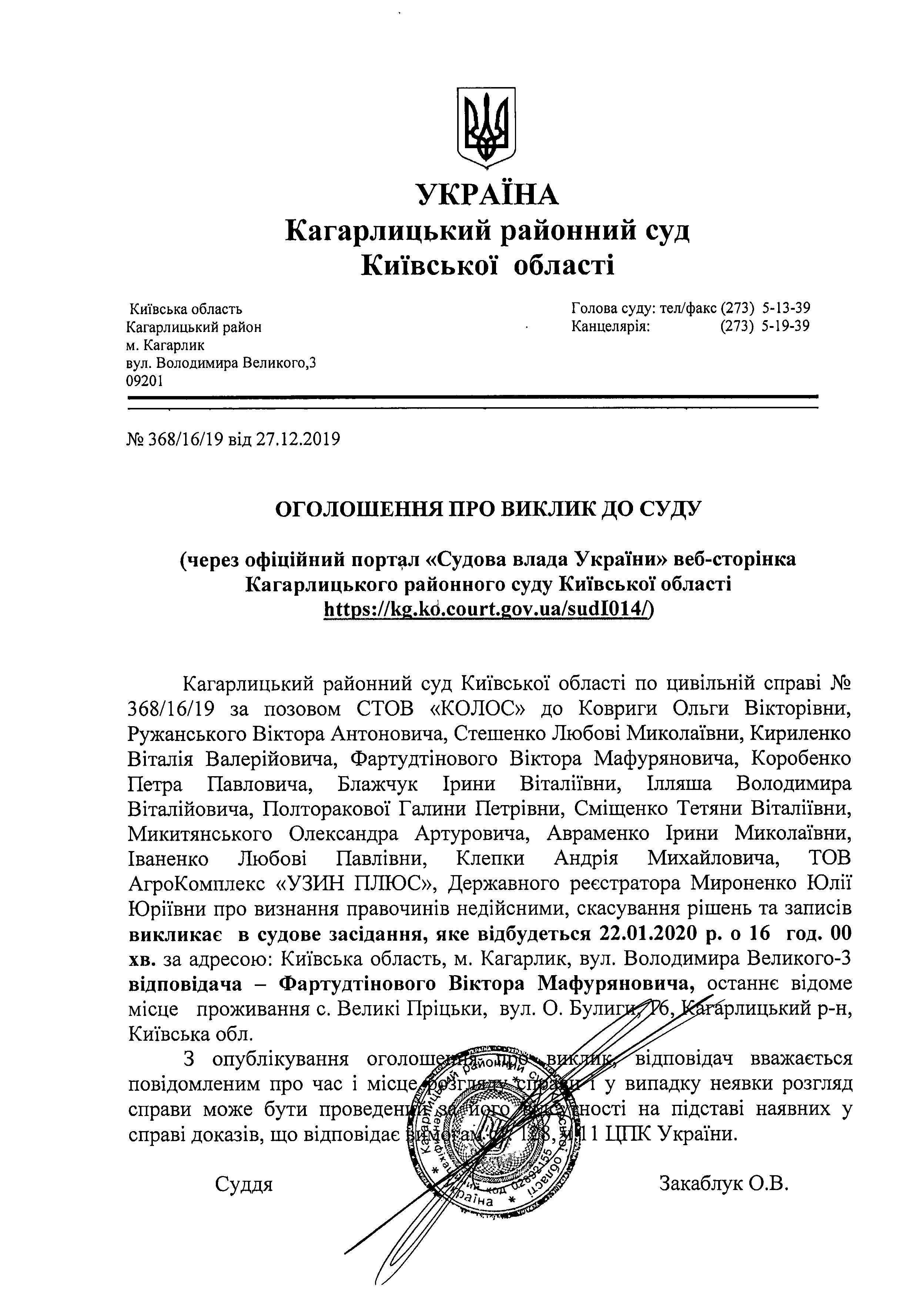 Виклик до суду Фартудінова Віктора Мафуряновича на 22.01.2020 р.