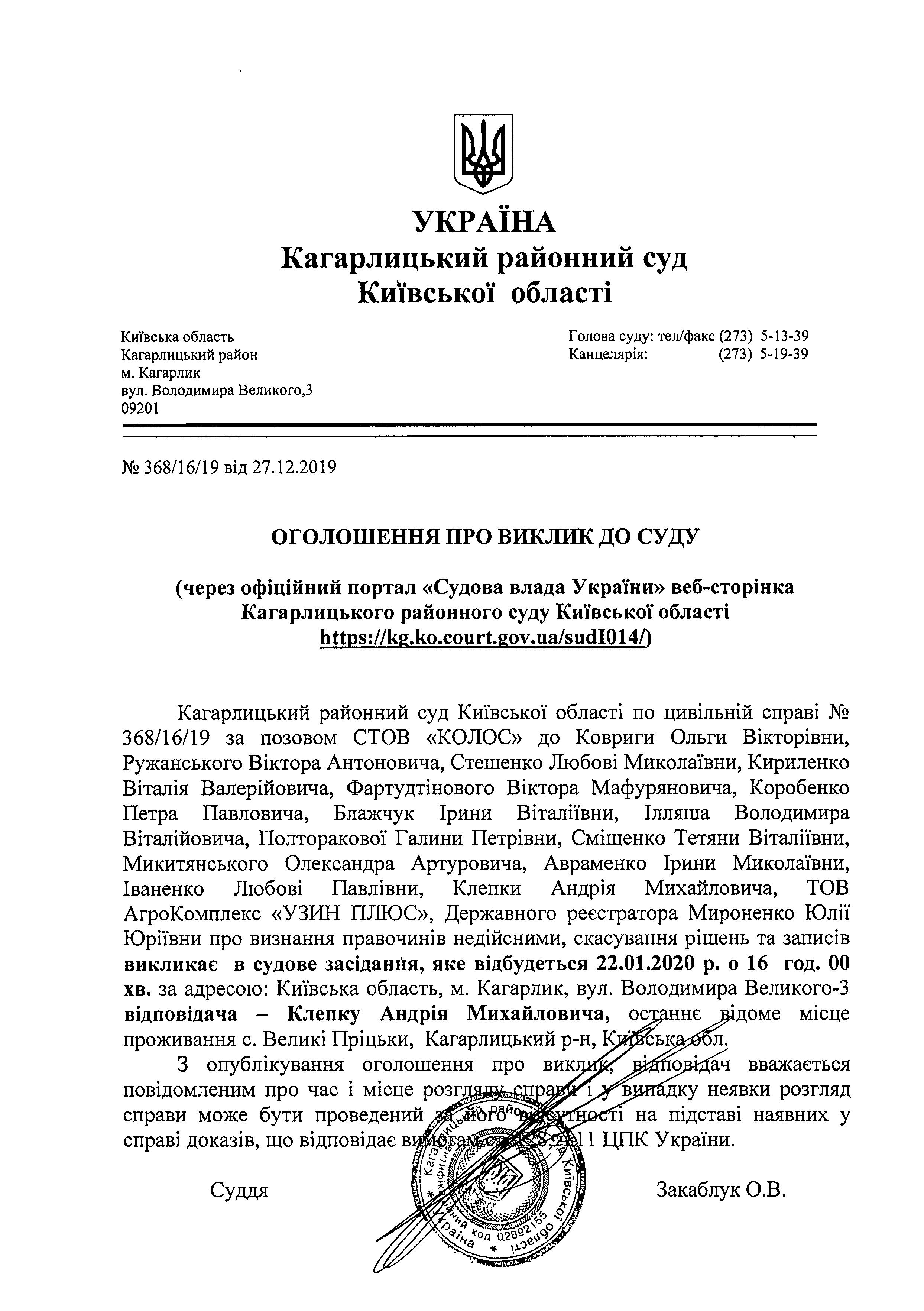 Виклик до суду Клепку Андрія Михайловича на 22.01.2020 р.
