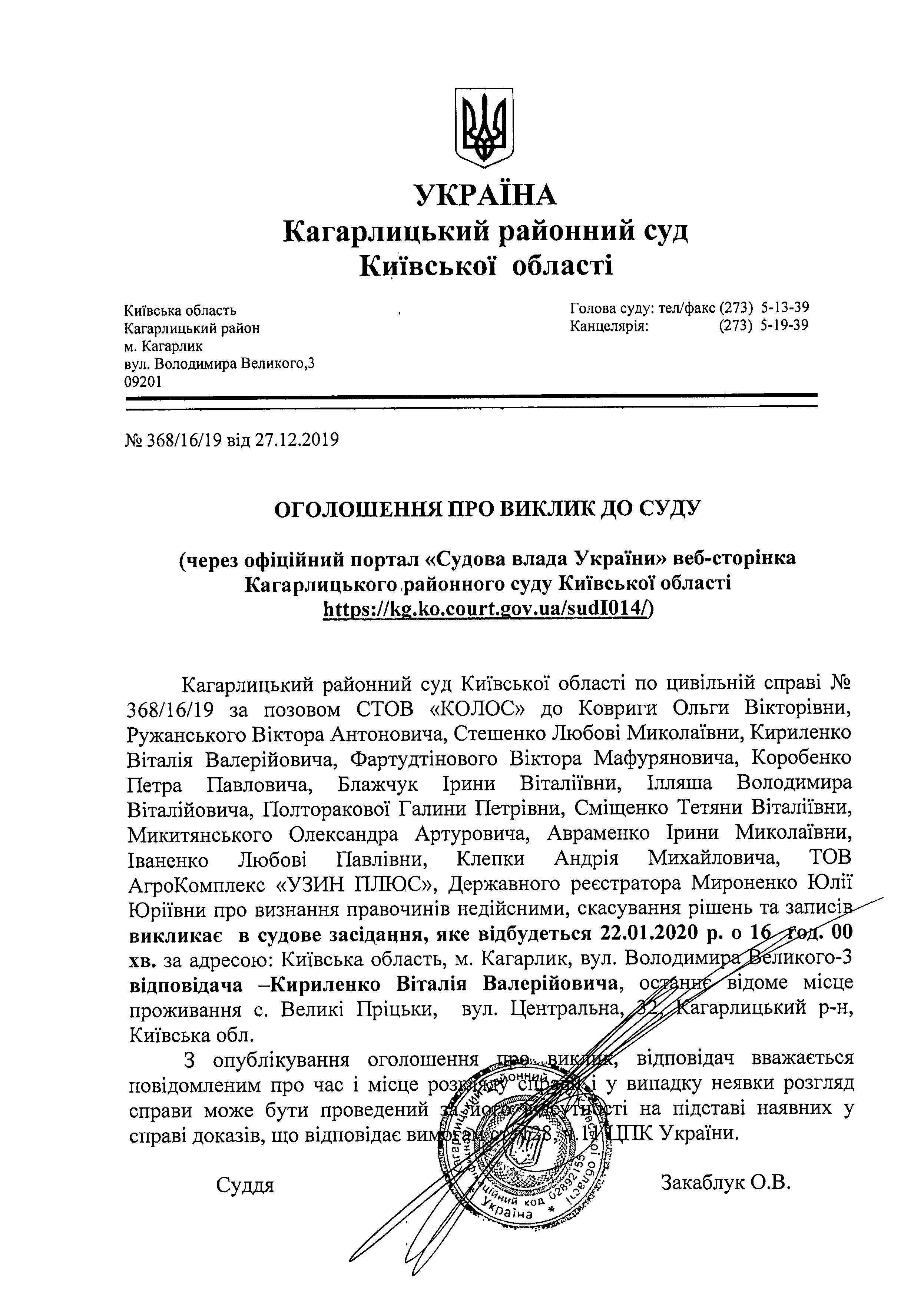 Виклик до суду Кириленка Віталія Валерійовича на 22.01.2020 р.