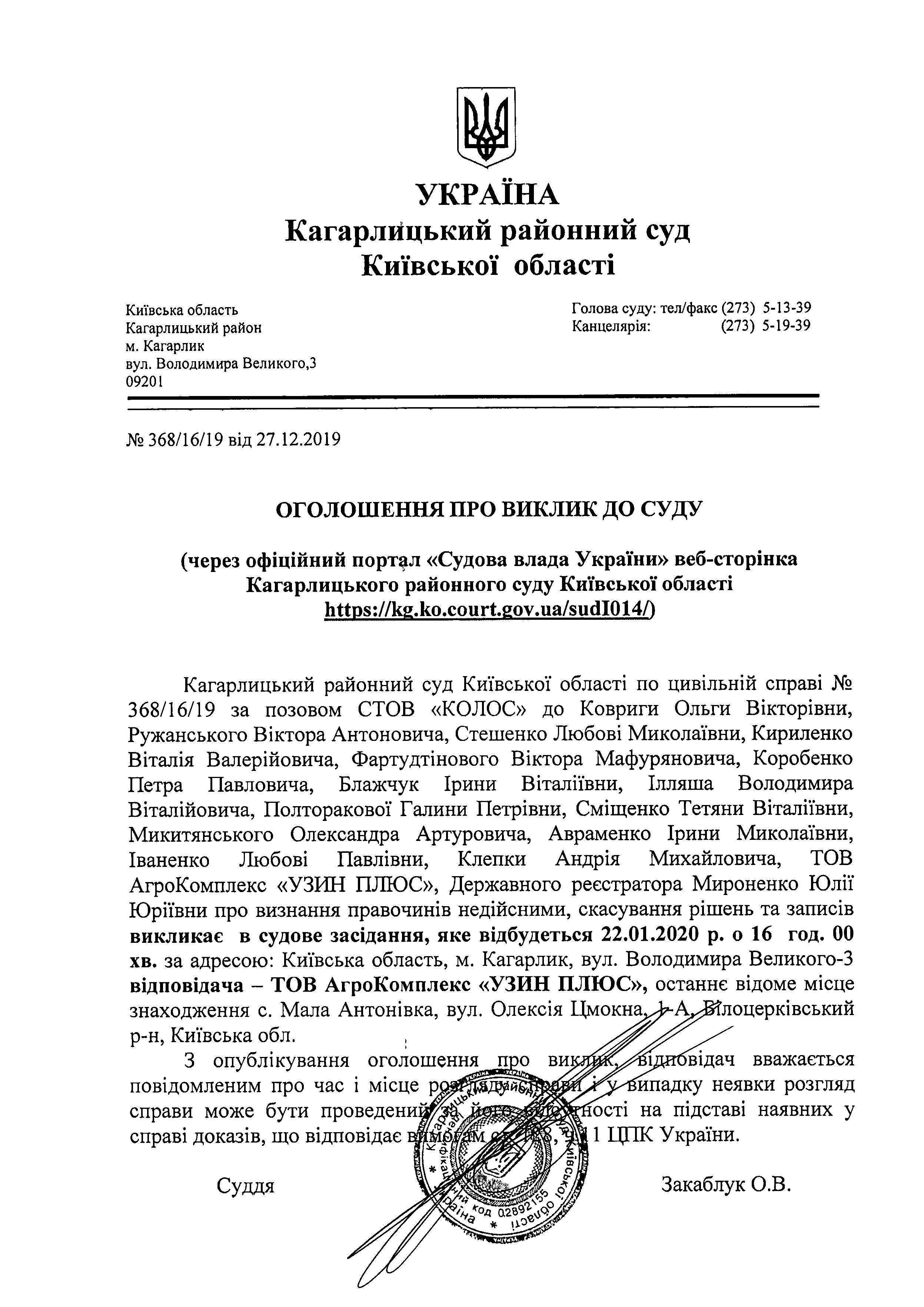 Виклик до суду ТОВ Агро Комплекс "Узан Плюс" на 22.01.2020 р.