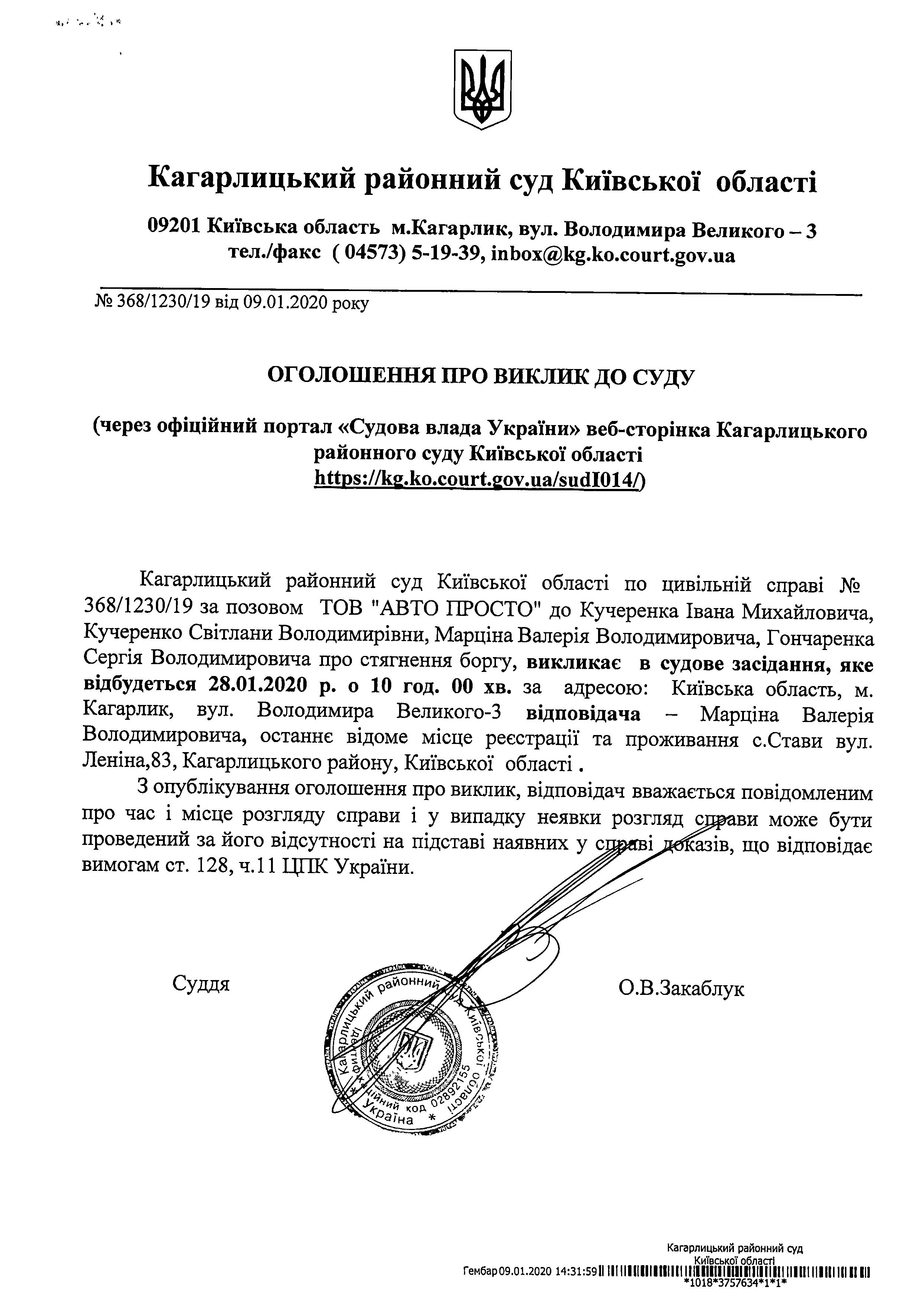 Виклик до суду Марціна Валерія Володимировича на 28.01.2020р