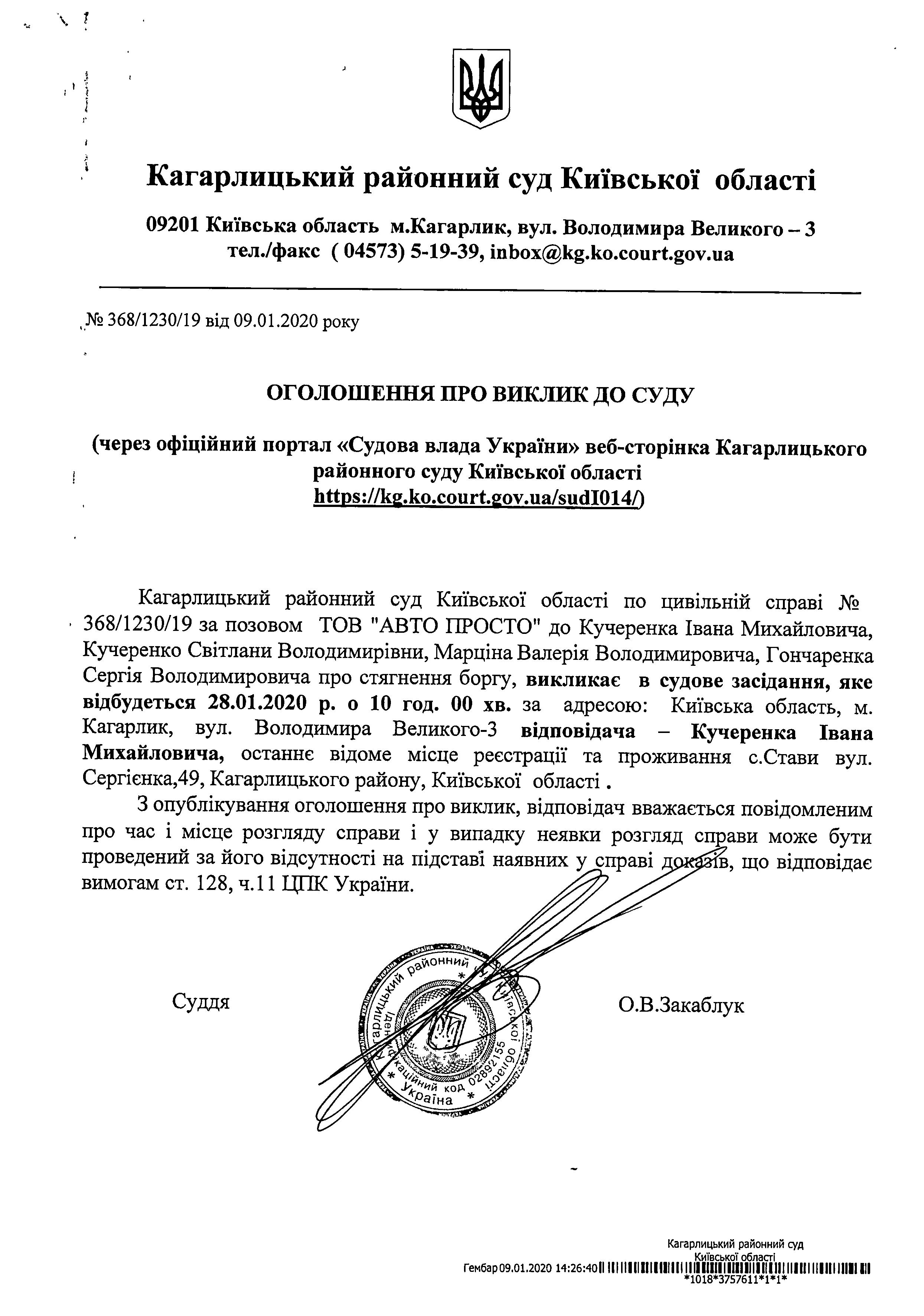 Виклик до суду Кучеренка Івана Михайловича на 28.01.2020р