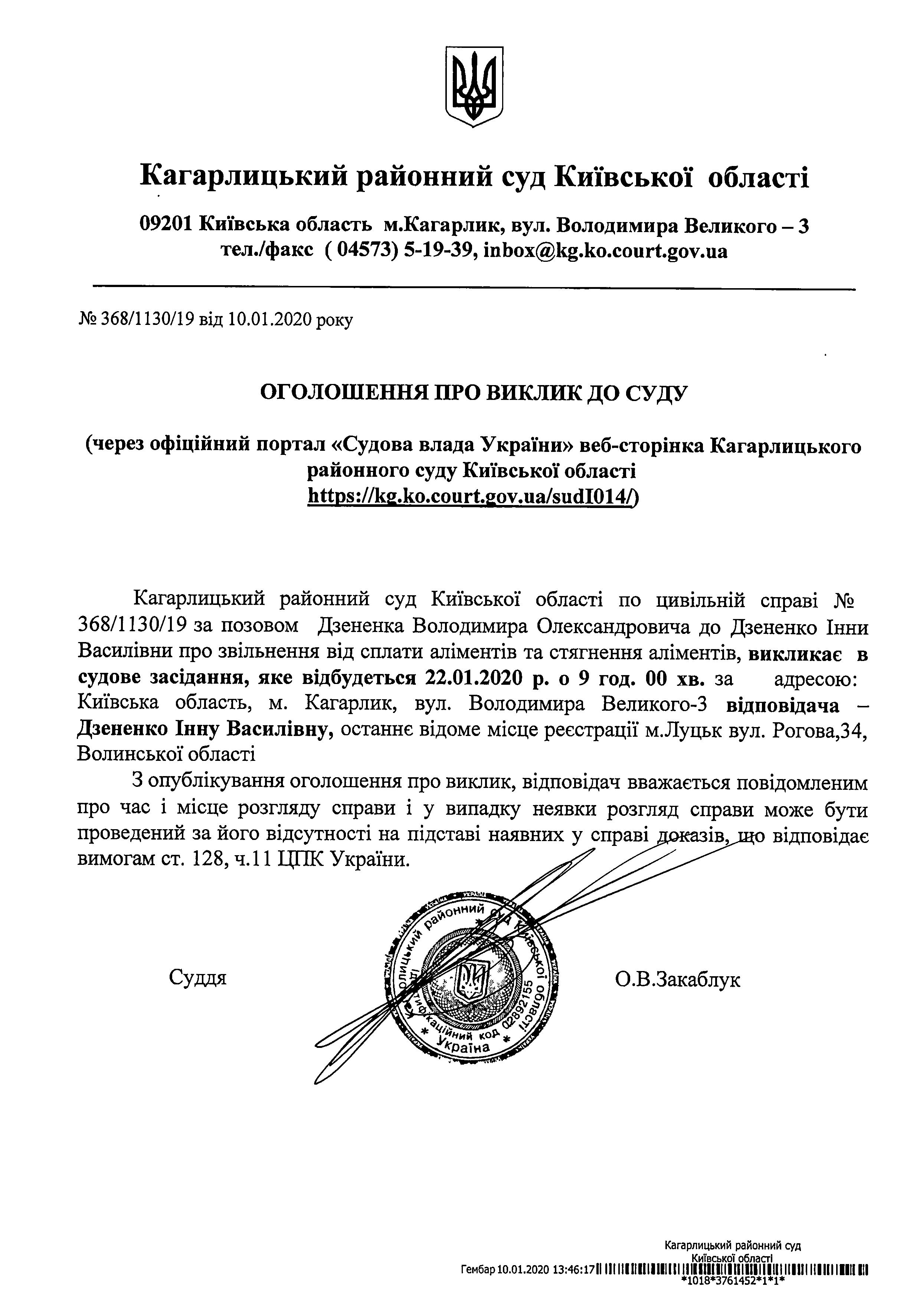Виклик до суду Дзененко Інну Василівну на 22.01.2020р